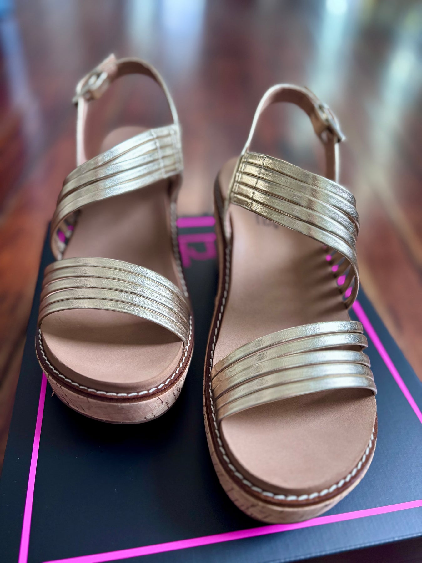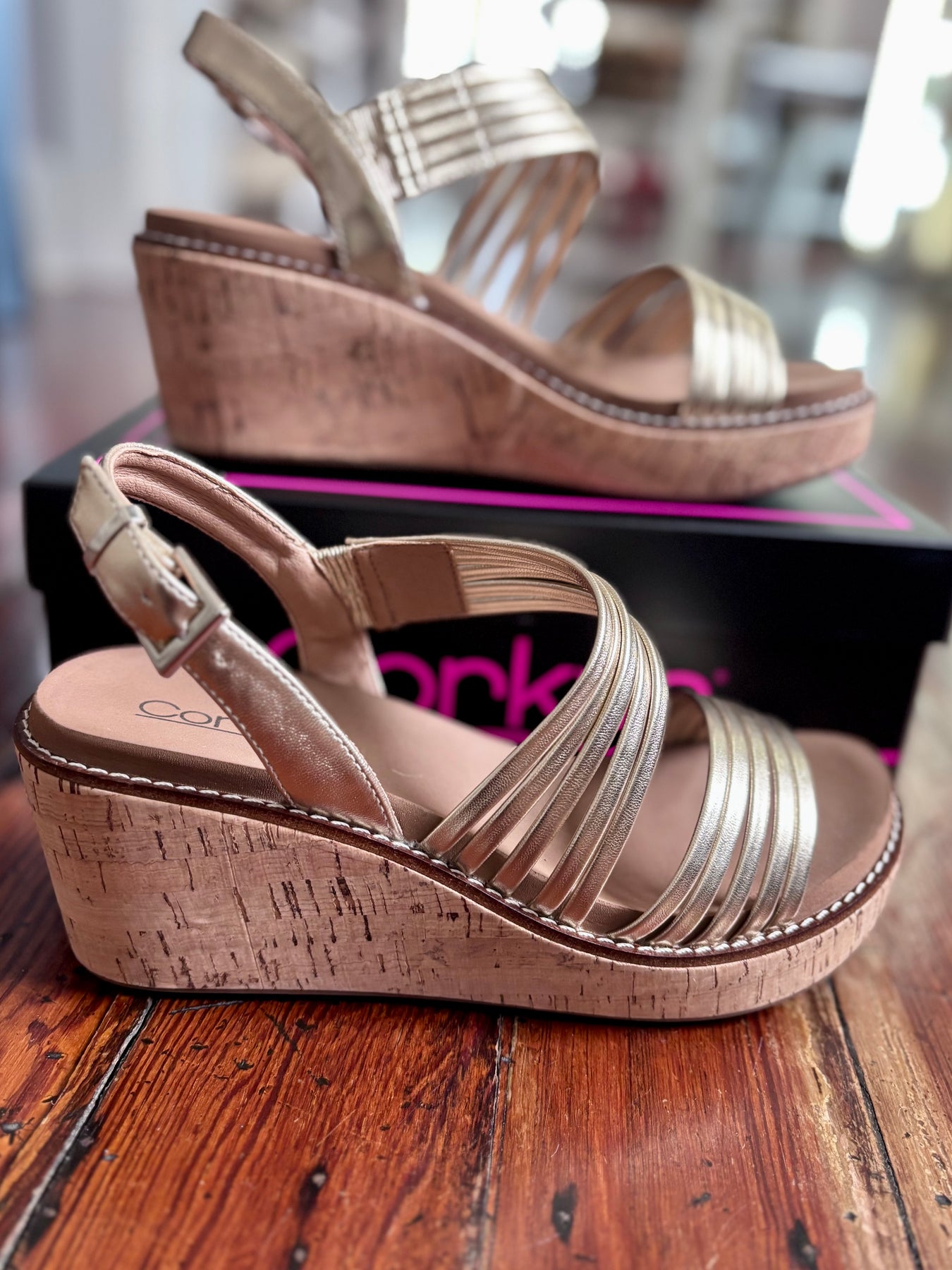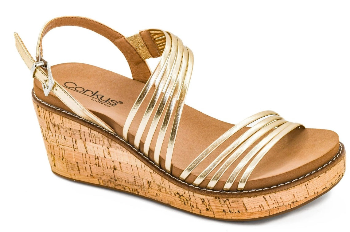 Now you can wear your favorite shoes to any occasion with the About Last Night Wedge! Strappy gold faux leather upper on the 2.75” memory foam wedge we love.