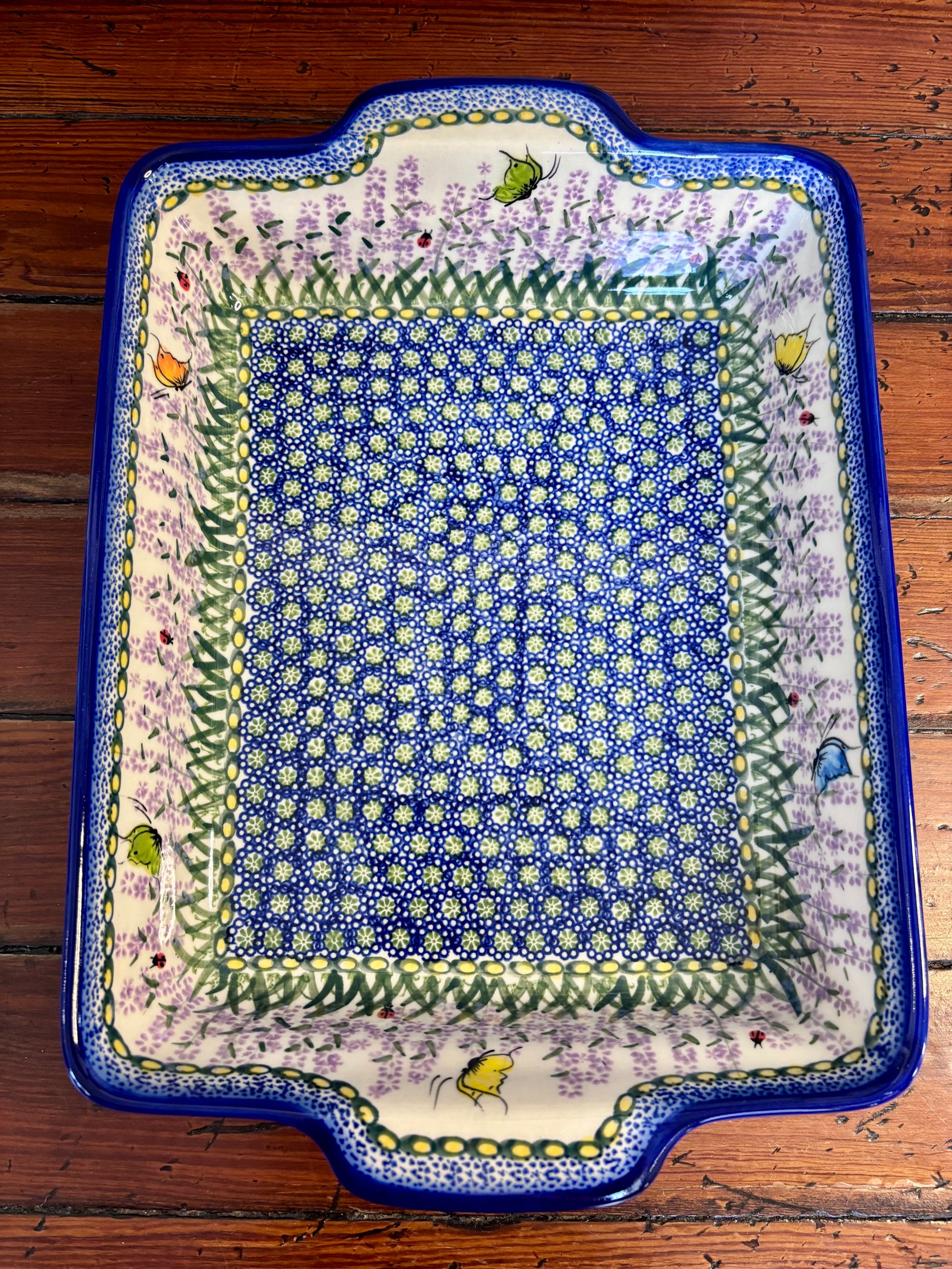 Gorgeous large lasagna baker. Straight edges and handles which add and extra 1” to each side.