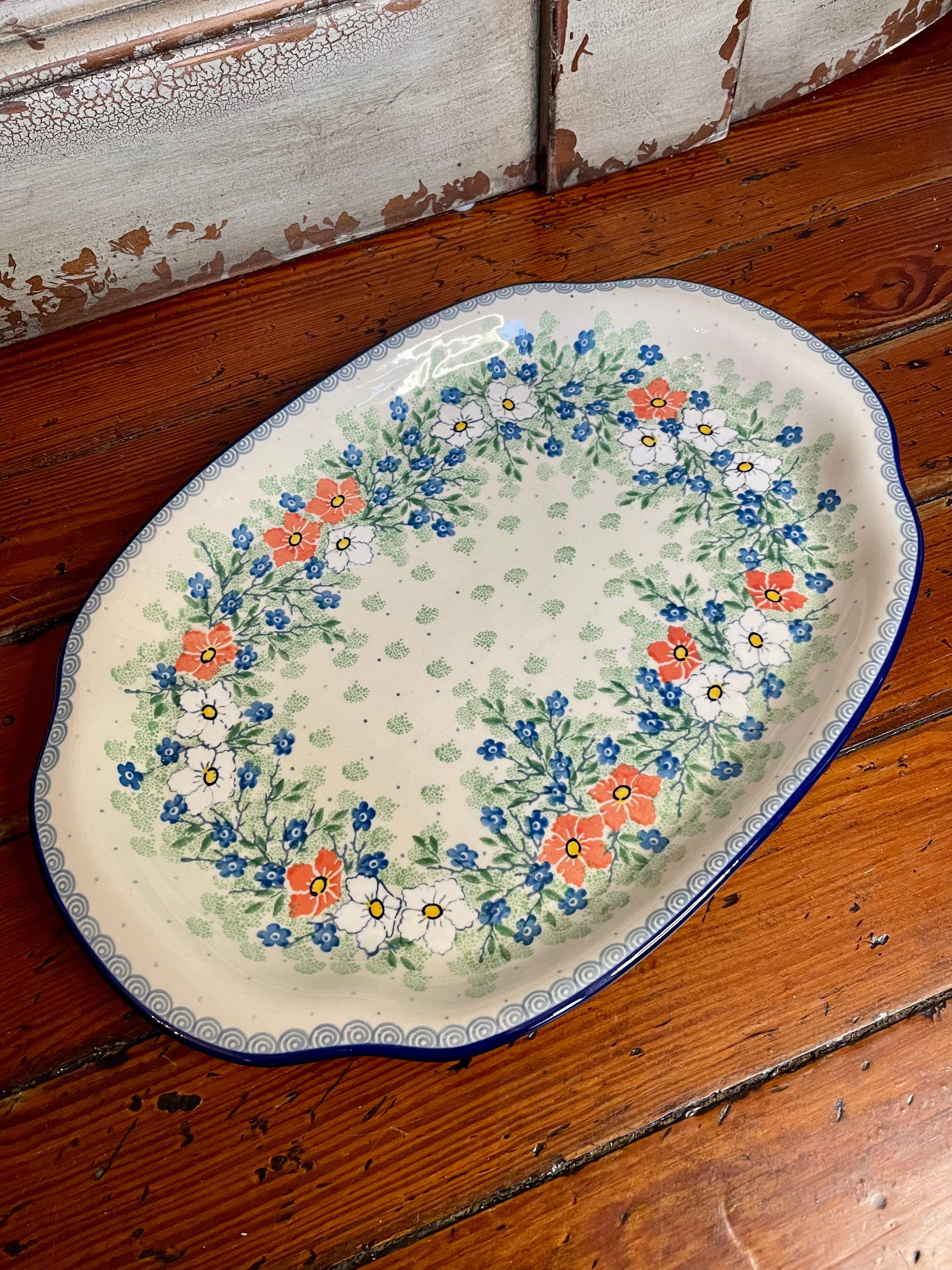Beautifully shaped platter with about a 1” depth and lipped edge for handles.