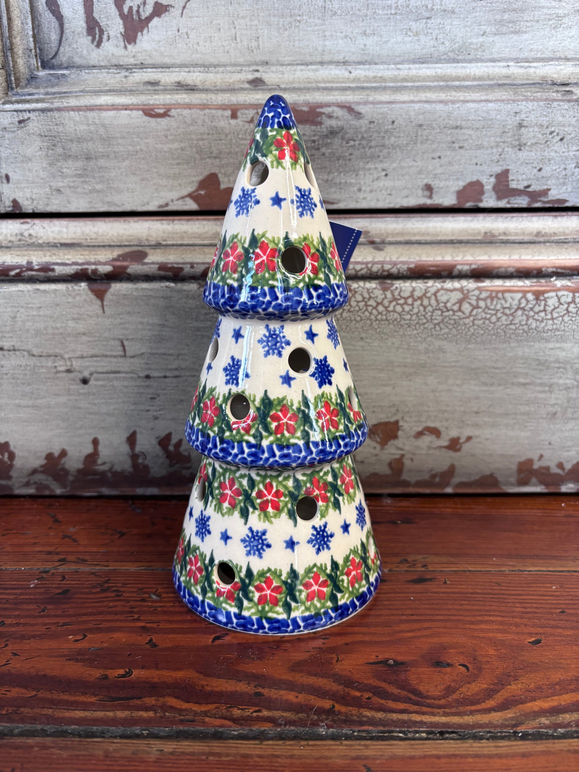 Tiered tree with holes throughout to illuminate the tea light that can be inserted from underneath.