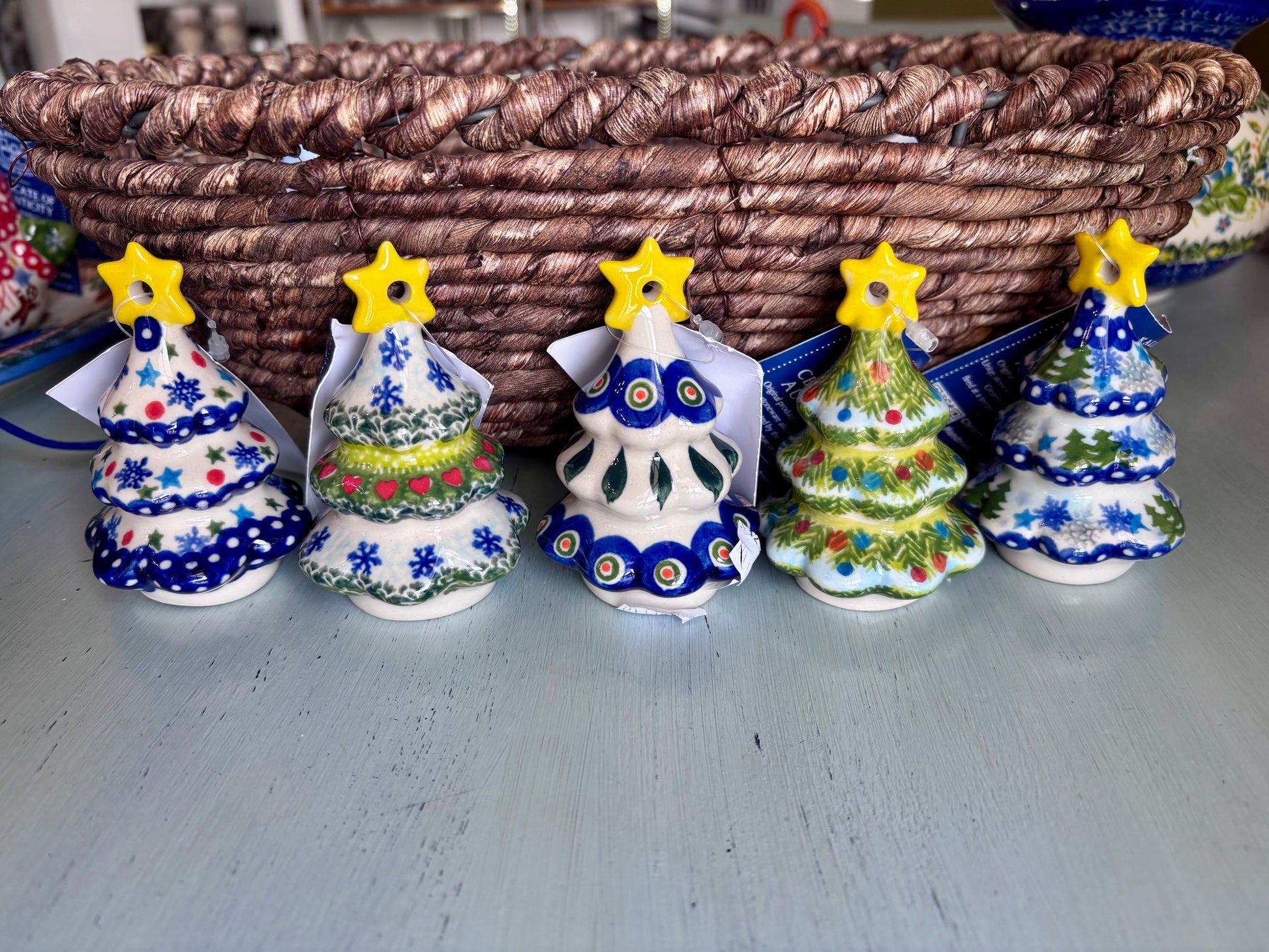 3.5” tall trees that can be displayed on a tree or set on a table. Various patterns. All signature series.