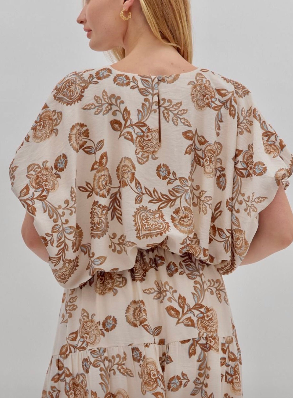 This is a blouson top — loose and billowy through the body, with fabric that softly drapes over the waistband to create a tucked, blouse-like effect. The sleeves are short and puffed, adding to the airy, romantic look. The warm brown floral pattern on the creamy backdrop feels like the first golden leaves of fall, while the airy fabric keeps it light and breezy. Fits a bit oversized.