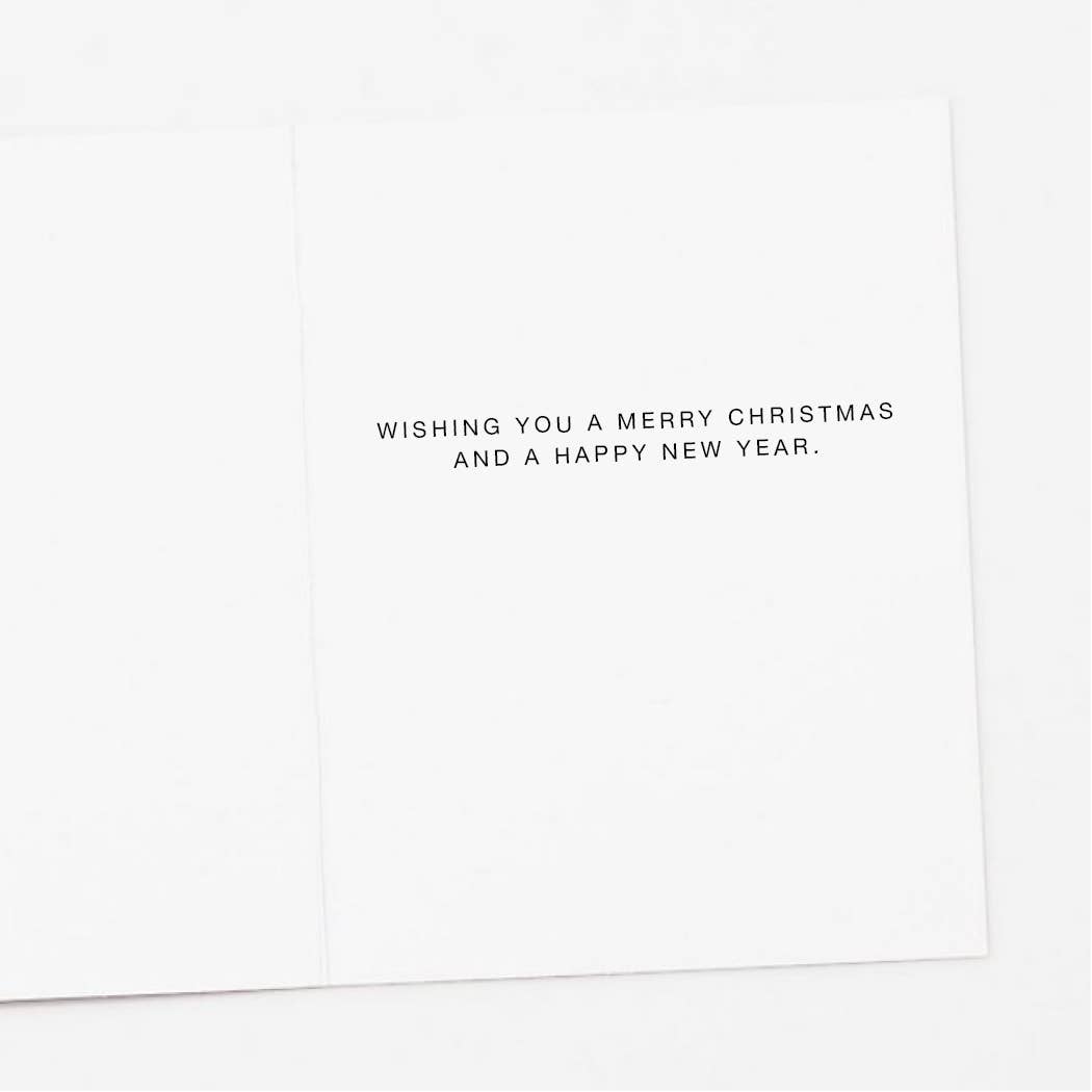 Box of 8 cards & envelopes. A2 Size Greeting Cards (4.25 x 5.5 inches folded). Inside greeting: "WISHING YOU A MERRY CHRISTMAS AND A HAPPY NEW YEAR." Printed on premium recycled paper. Paired with recycled brown kraft envelopes. Packaged in cello/clear box.
