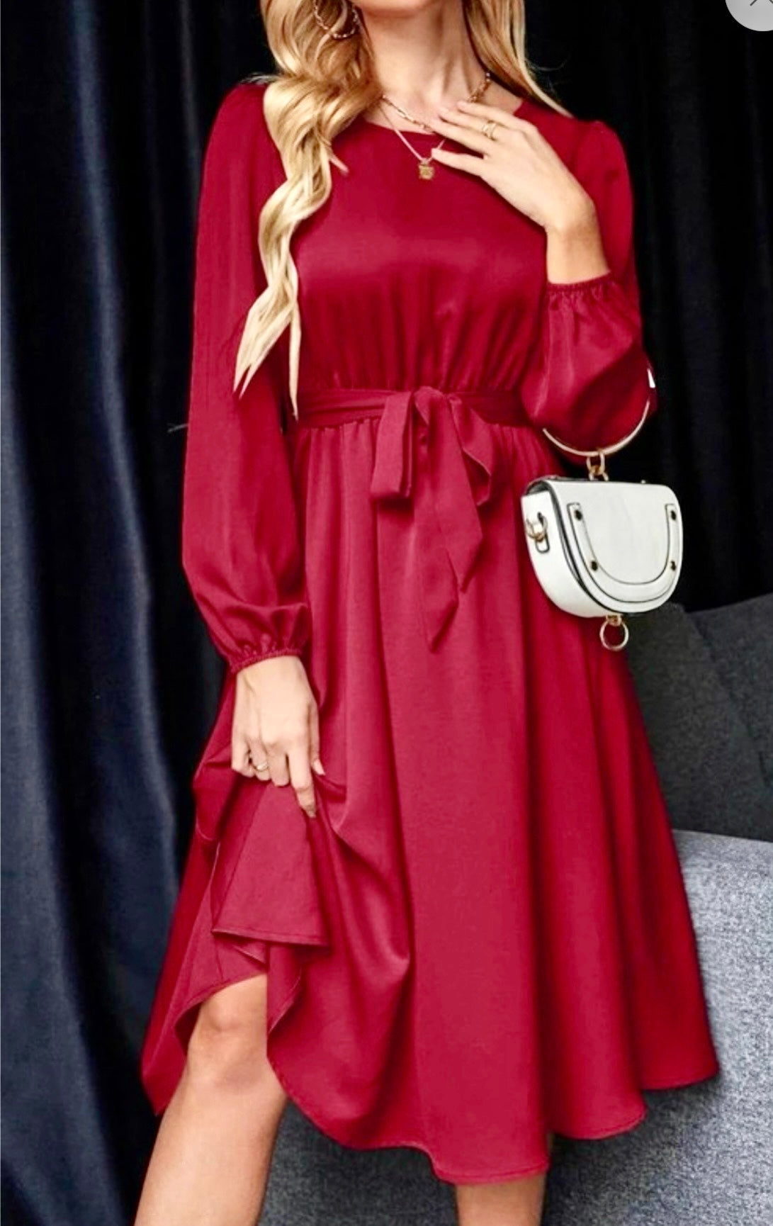 Beautiful red satin dress that has an elasticized waistband and cuffs. Sash included. Almost a midi length. Lightweight and unlined. Perfect for holiday gatherings! Fits true to size.