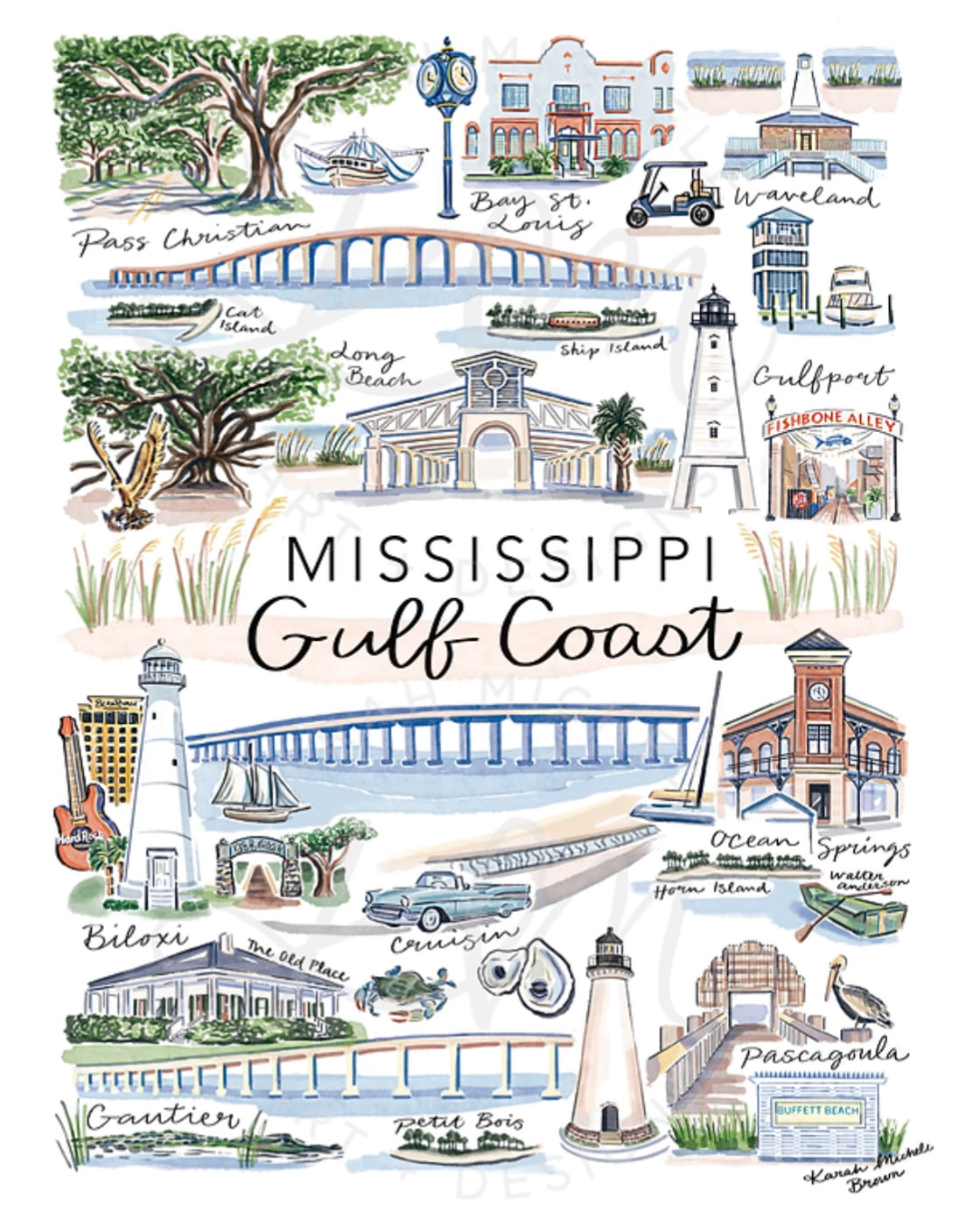 Local artist Karah Michele captures our coastal cities in these unique drawings! Each City Print consists of local favorite and historical places that are in that particular city.This print comes in sizes 8" x 10" and makes the best gift to a friend or loved one!