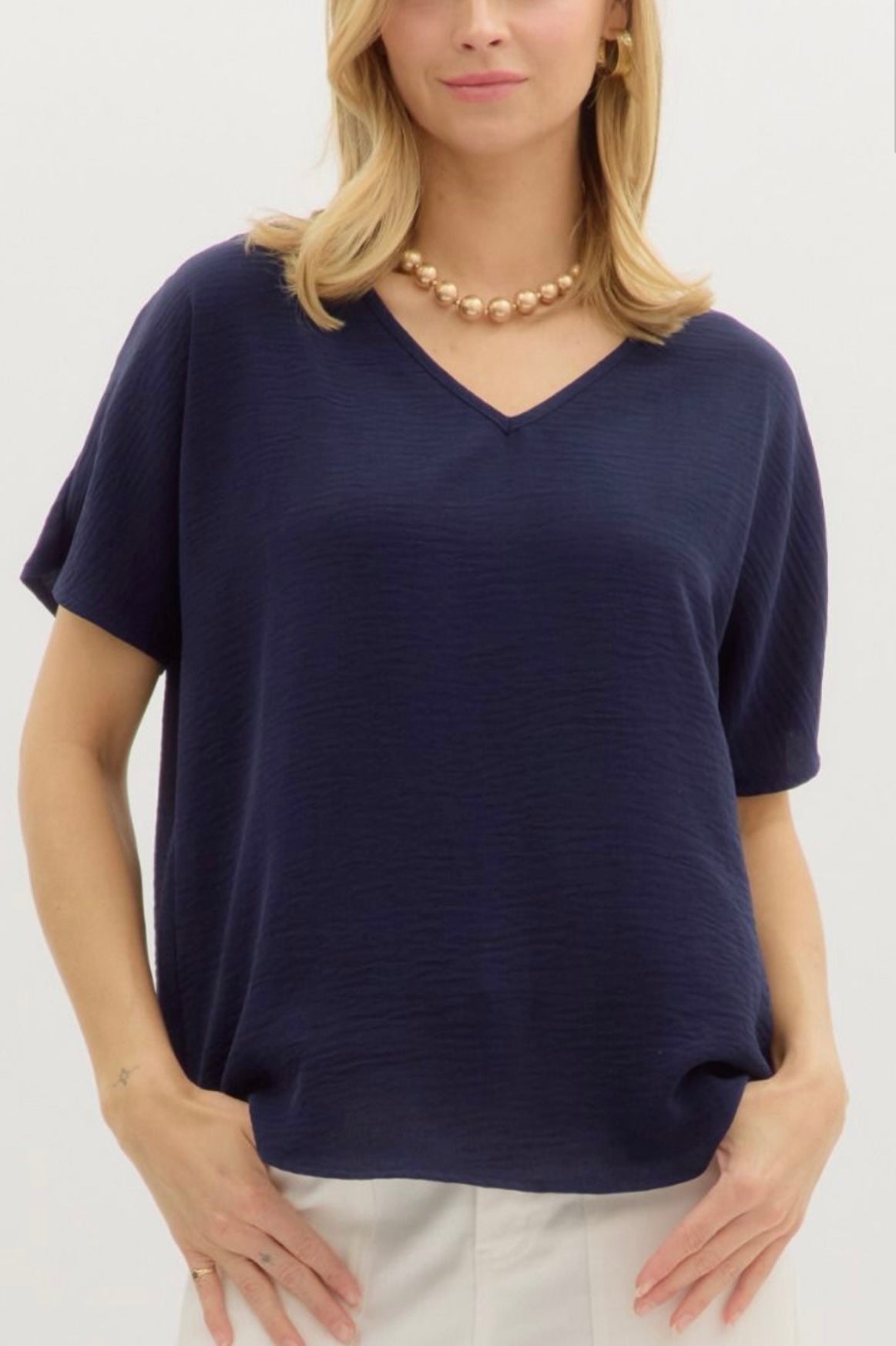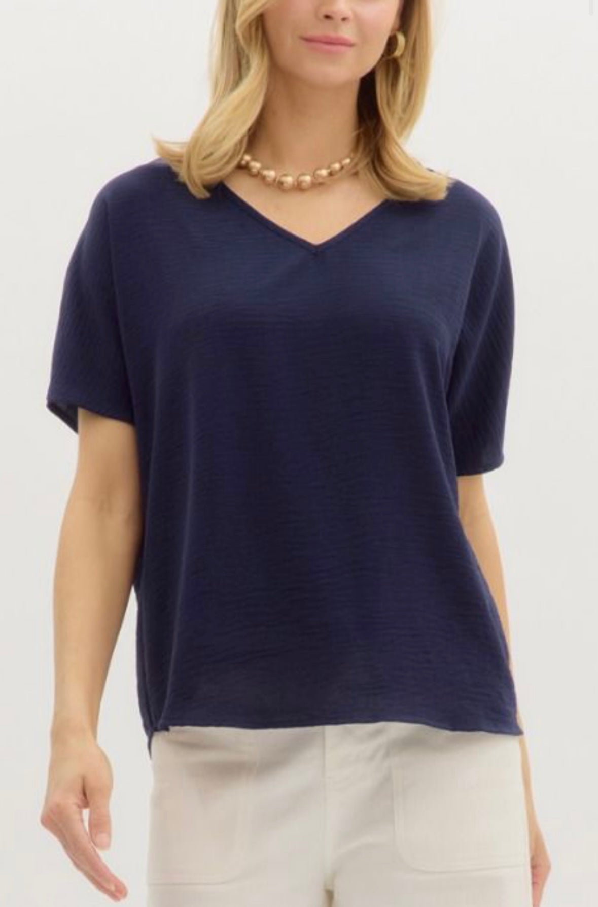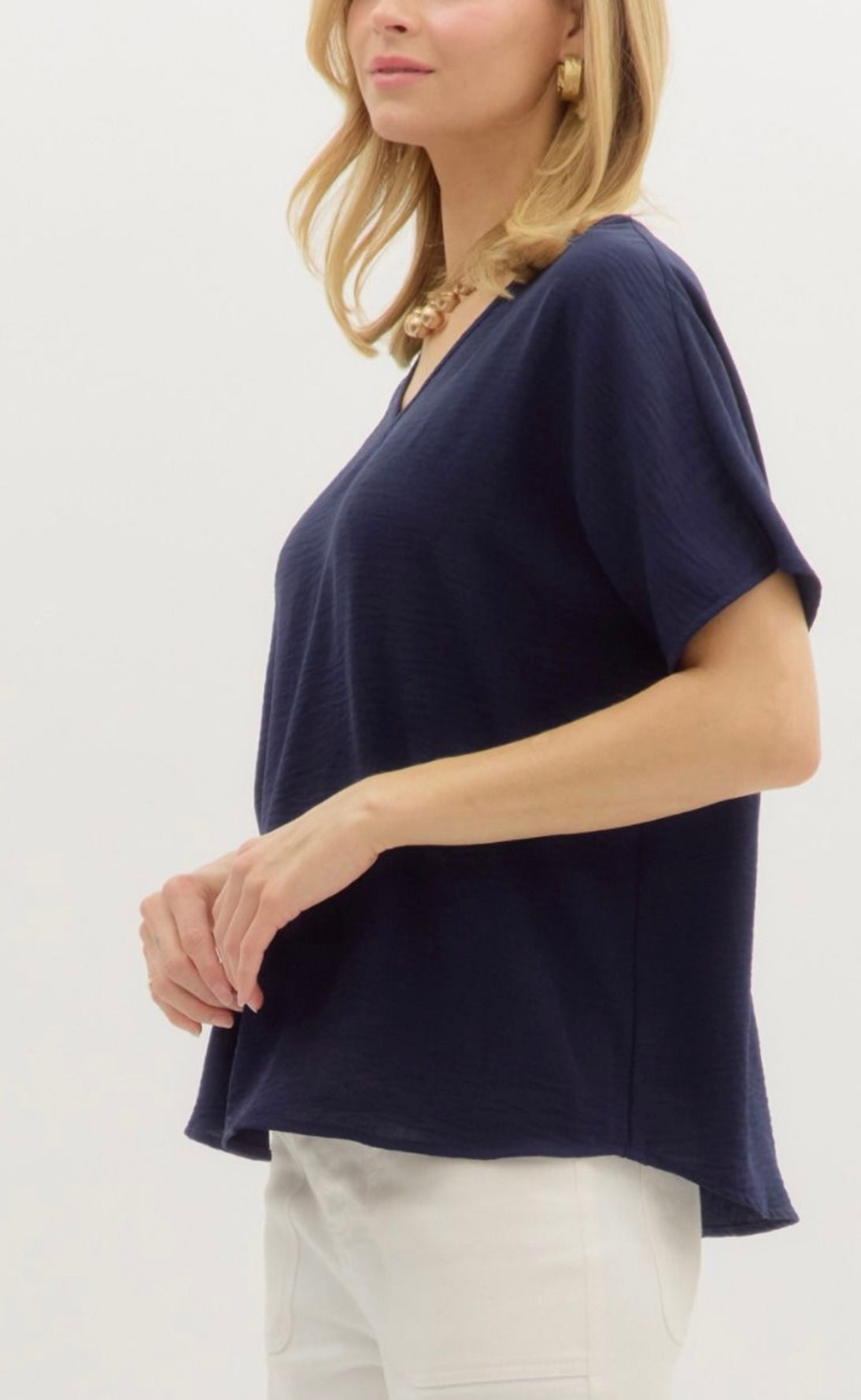 Solid v-neck top featuring asymmetric rounded hem detail. Unlined. Semi-sheer. Woven. Lightweight. Fits relaxed.