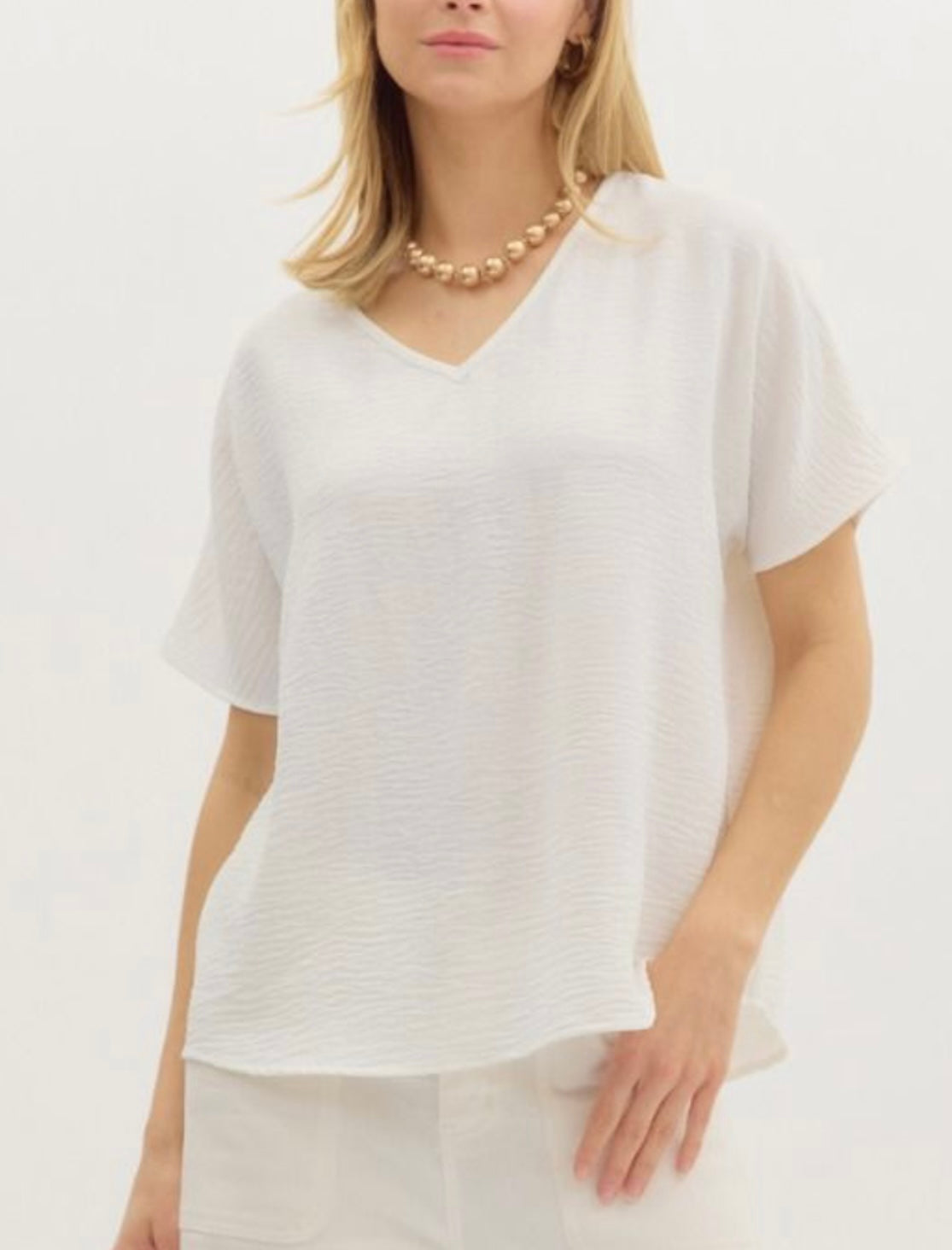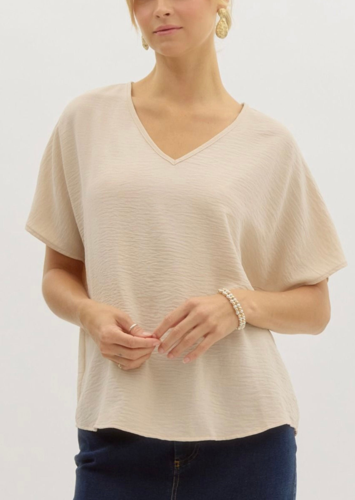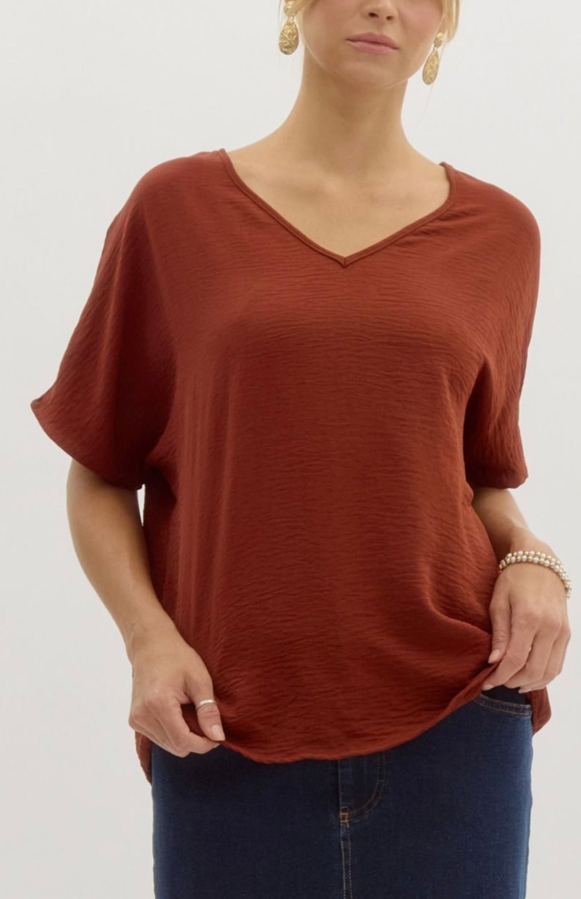 Solid v-neck top featuring asymmetric rounded hem detail. Unlined. Semi-sheer. Woven. Lightweight. Fits relaxed.