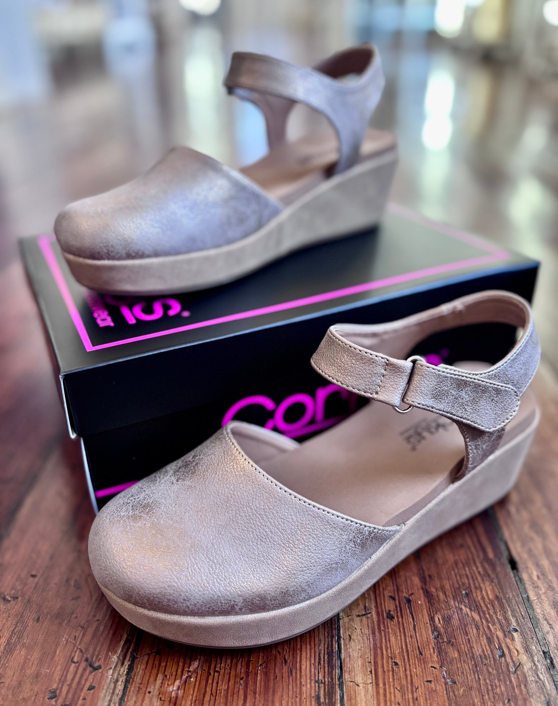 A fresh twist on the classic mary jane, the All In faux leather platform sandal pairs a cork-wrapped wedge with an easy hook-and-loop strap for all-day comfort and casual charm.