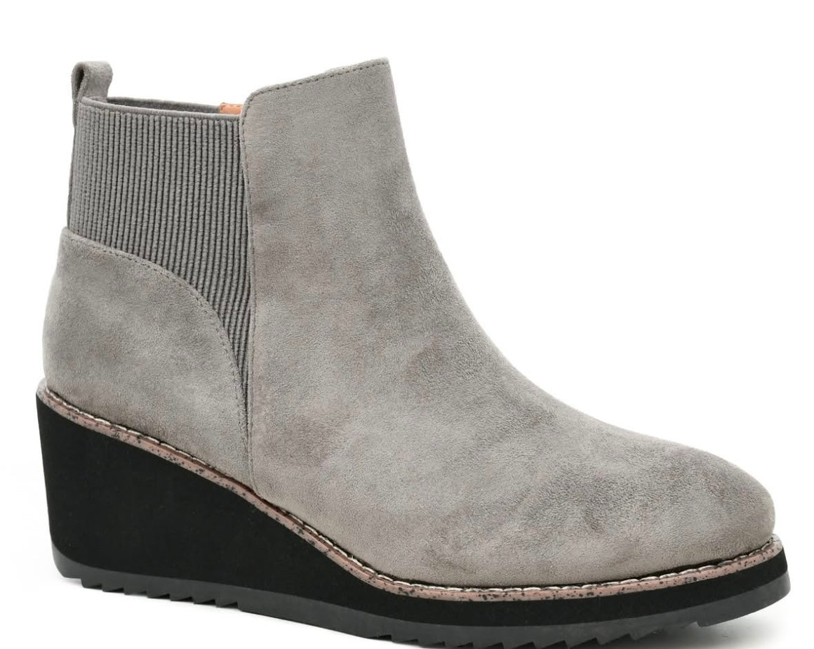 Sleek, simple, and endlessly wearable—this wedge ankle boot is your go-to for effortless style. Designed in a soft neutral faux suede, it pairs with literally everything in your closet. The hidden wedge heel gives you a comfortable lift without sacrificing all-day wear, while the elastic side panels make slipping them on a breeze. From jeans and sweaters to dresses and tights, these boots are the versatile staple you’ll live in all season long.