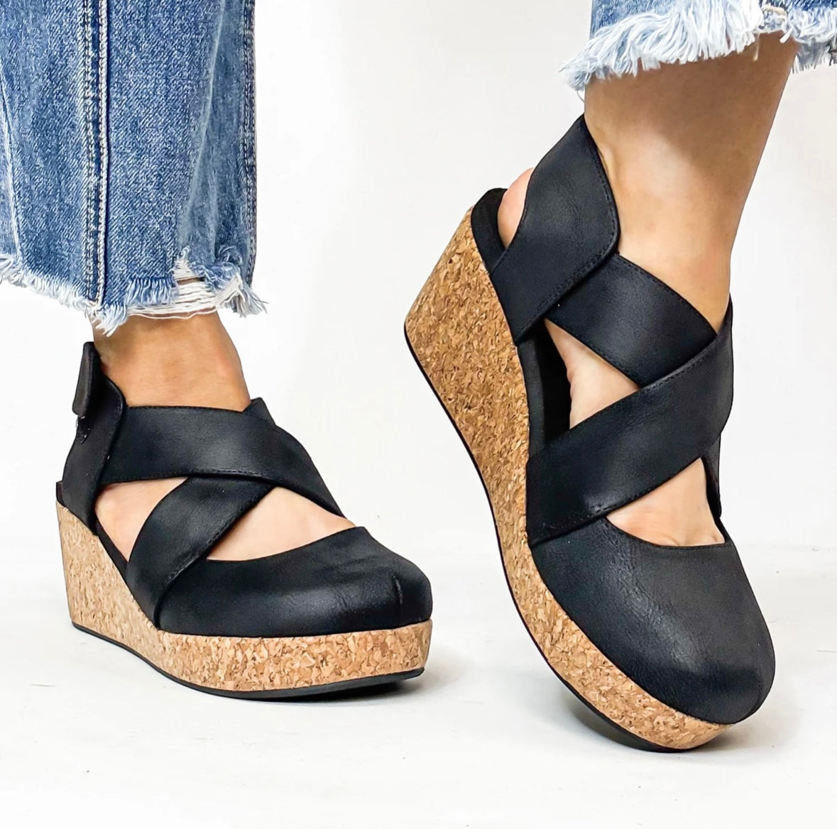 Keep it sleek and effortless in these black crisscross cork wedges—where comfort meets everyday cool. With wide supportive straps, a closed toe, and an adjustable Velcro slingback, these sandals are perfect for work, travel, or anytime you need reliable, stylish lift.