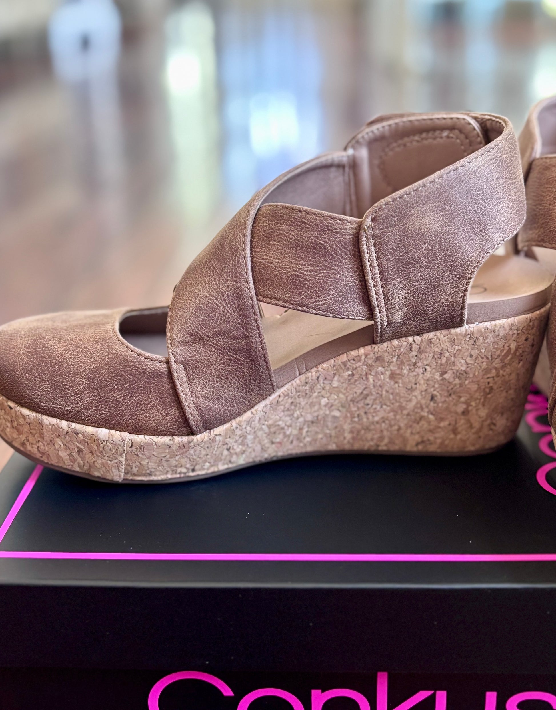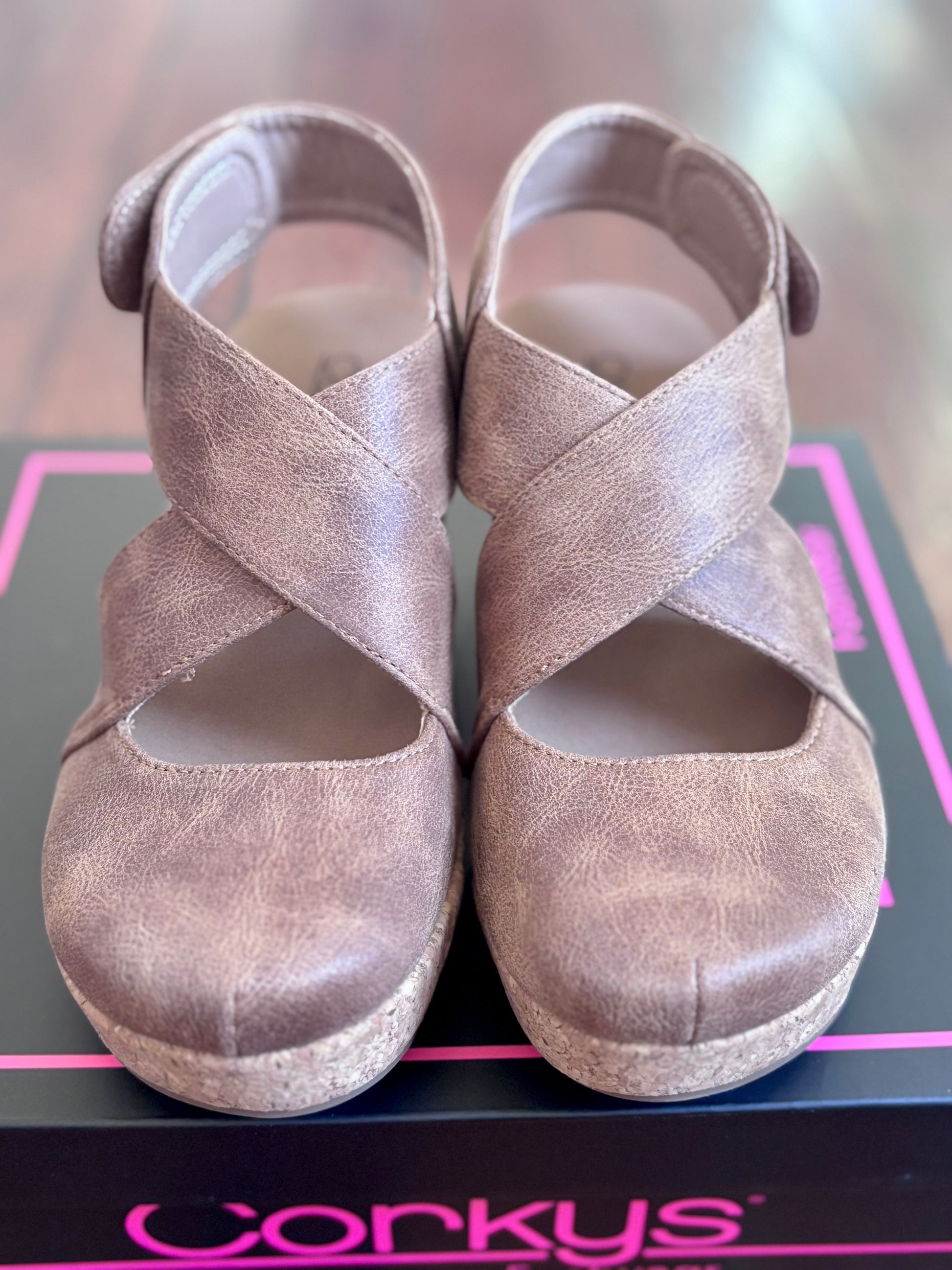 Keep it sleek and effortless in these tan crisscross cork wedges—where comfort meets everyday cool. With wide supportive straps, a closed toe, and an adjustable Velcro slingback, these sandals are perfect for work, travel, or anytime you need reliable, stylish lift.