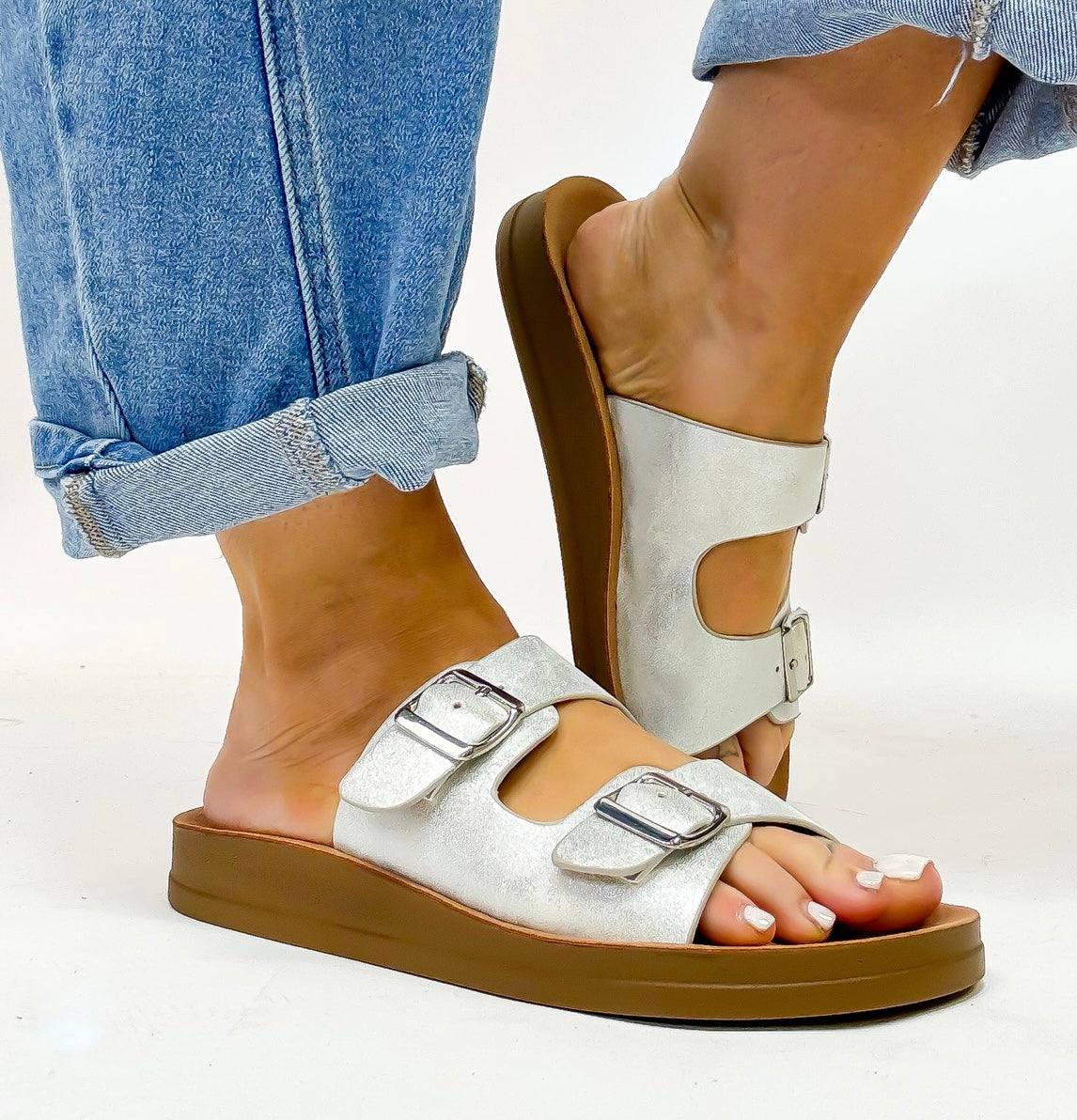 Introducing Corky's White Metallic Let's Be Real Sandals, the perfect sandals for everyday wear. With a double buckle detail, these casual sandals add a touch of style to any outfit. Stay comfortable and stylish all day long with Corky's White Metallic Let's Be Real Sandals!