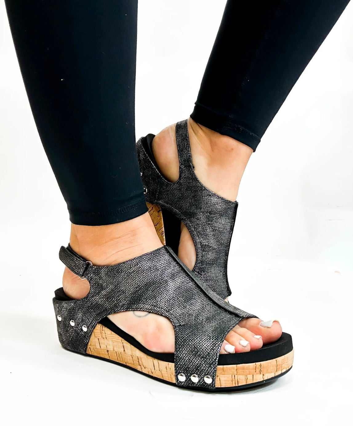 Say goodbye to uncomfortable heels with our Corky's Black Shimmer Texture Volta II Wedges! Featuring a signature foam footbed, these wedges offer both style and comfort. With a variety of styles to choose from, you'll be hooked on these wedges. Choose comfort without sacrificing fashion!