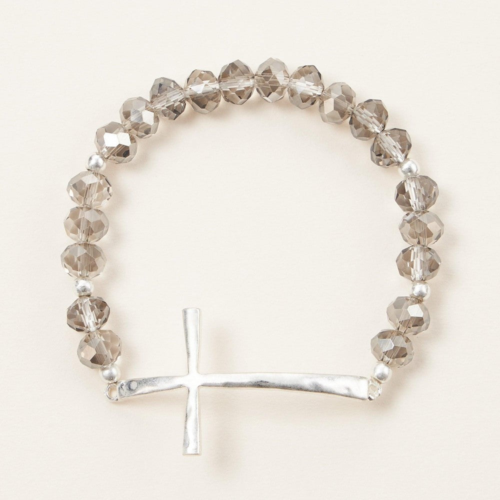 Faceted Bead Beaded Stretch Bracelet Featuring Hammered Metal East West Cross