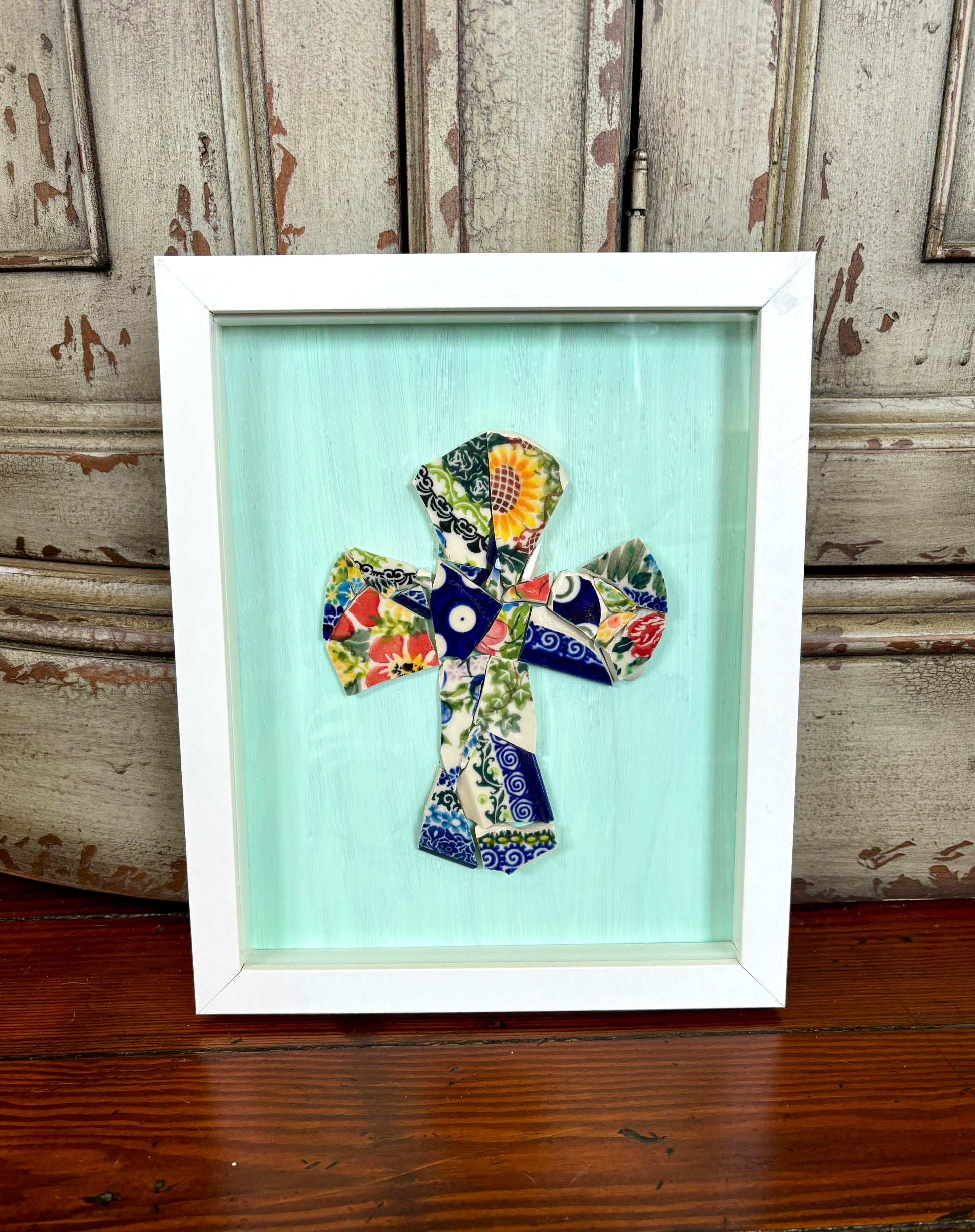 Pieces of Polish Pottery made onto a mosaic of a cross in an 8 x 8 shadow box.