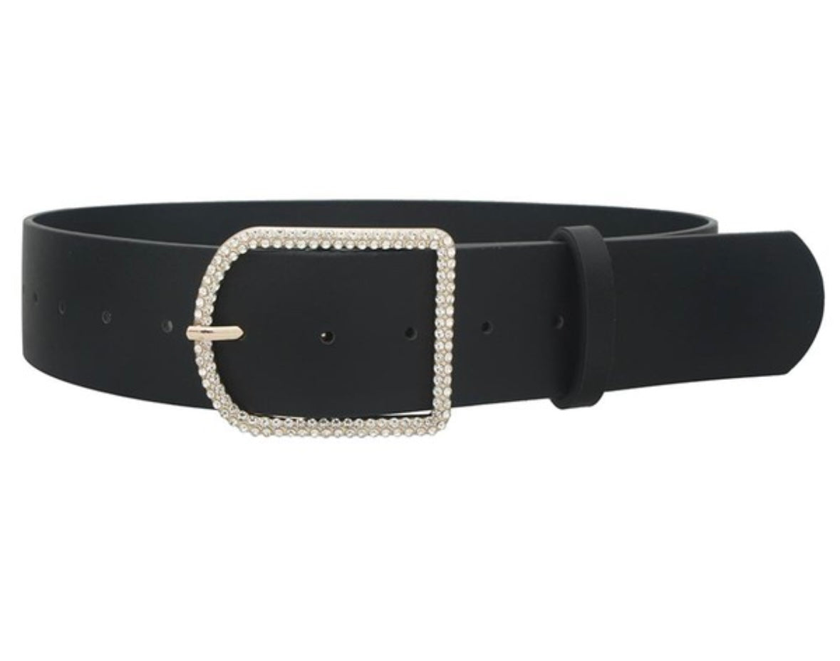 3” D-shaped rhinestones buckle on a 42”belt that is 2” wide. PU leather.