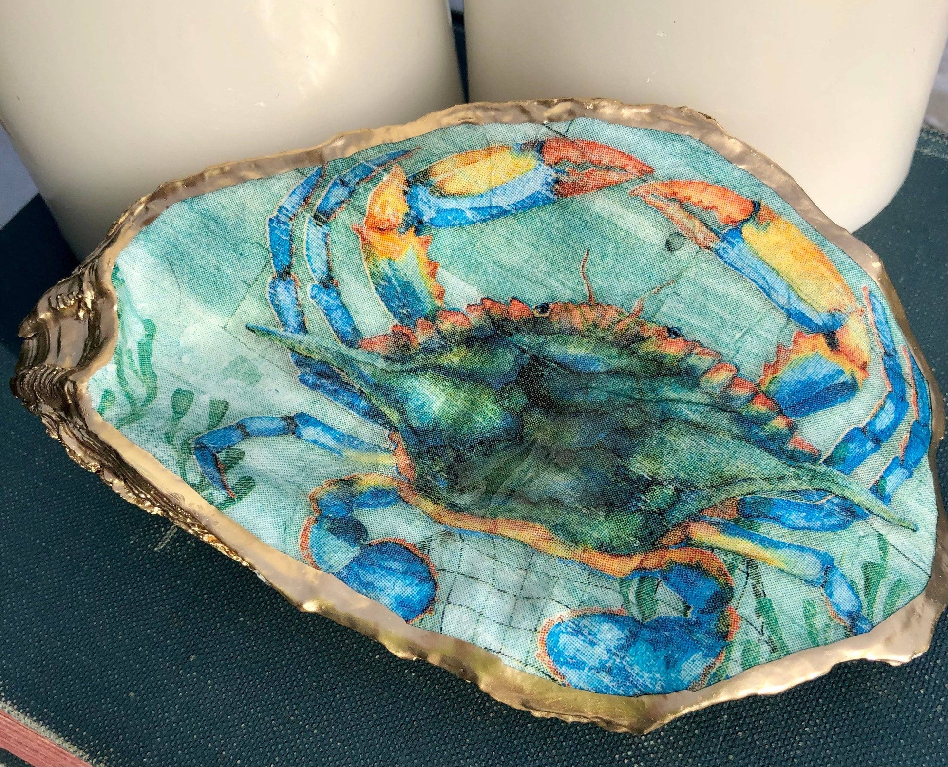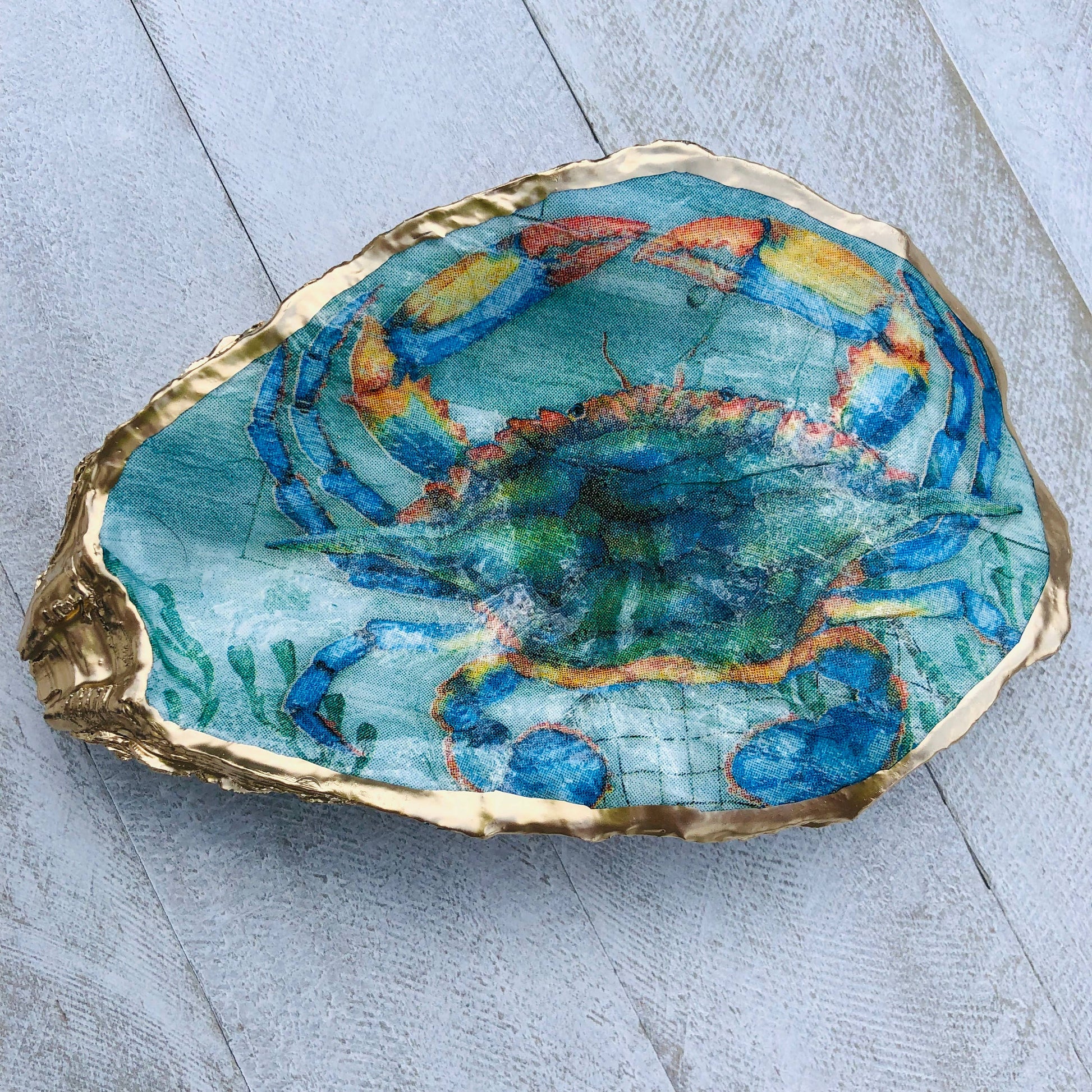 Decoupage Oyster Ring Dish--Blue Crab