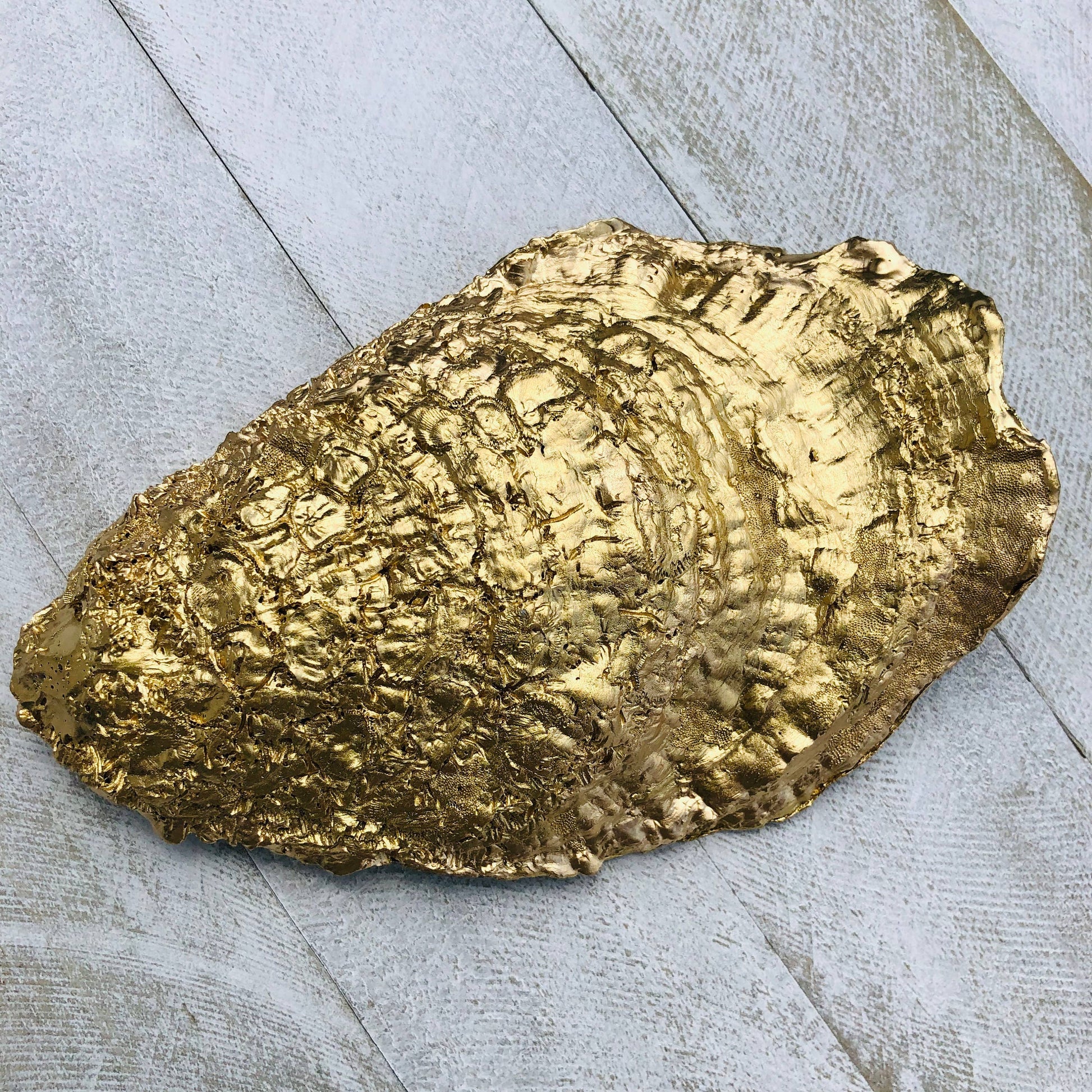A natural NC oyster is embellished with decoupaged print and finished the reverse side with gold enamel and gold enamel trim. The perfect place to keep small treasures on your desk, nightstand or beside the sink. So pretty that it can will add a little sparkle to any place in your home! Shells are approximately 3-4.5in long and item is made to order. Due to the natural variations of the oyster shells, the exact size of shell and details within pattern of print will vary.