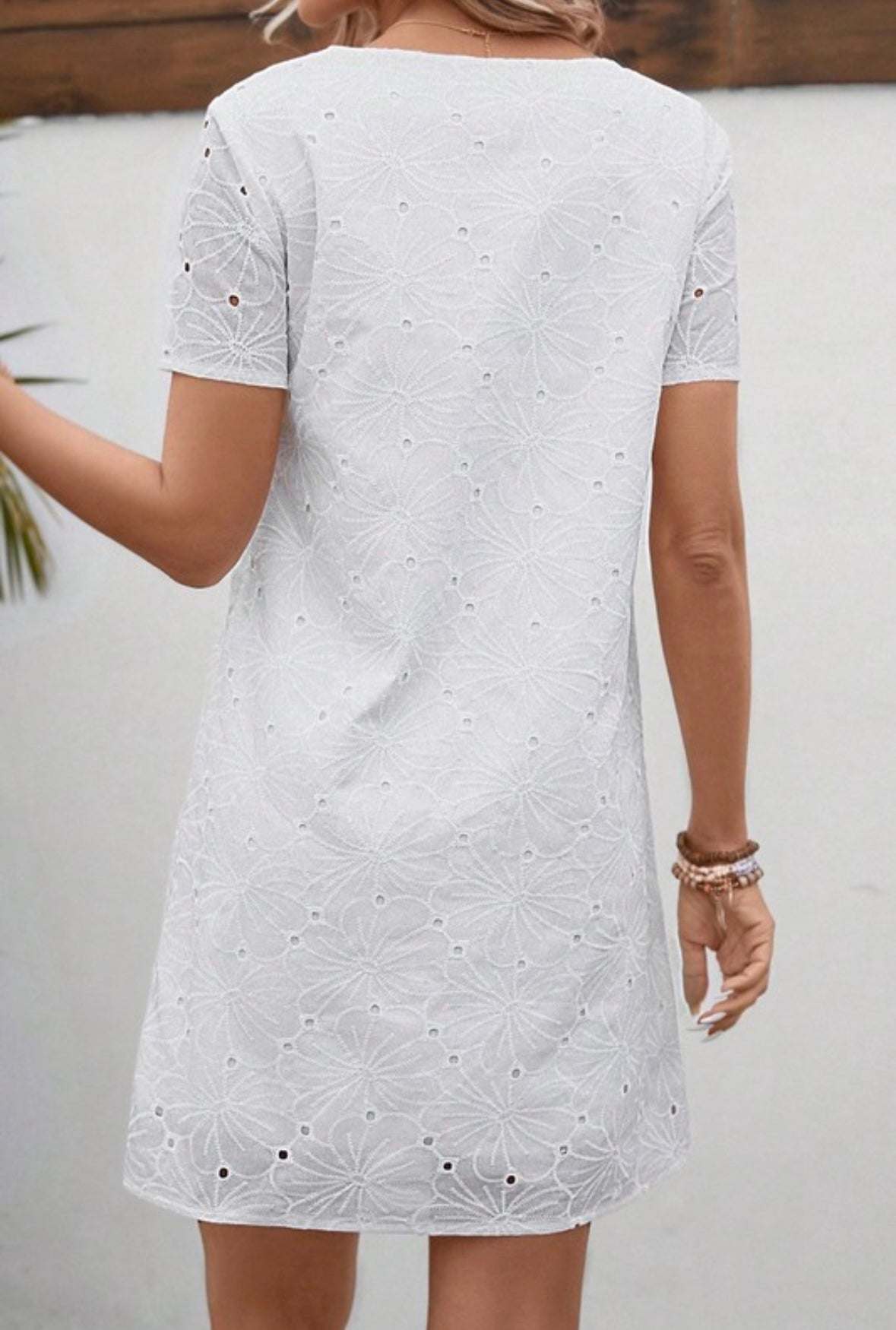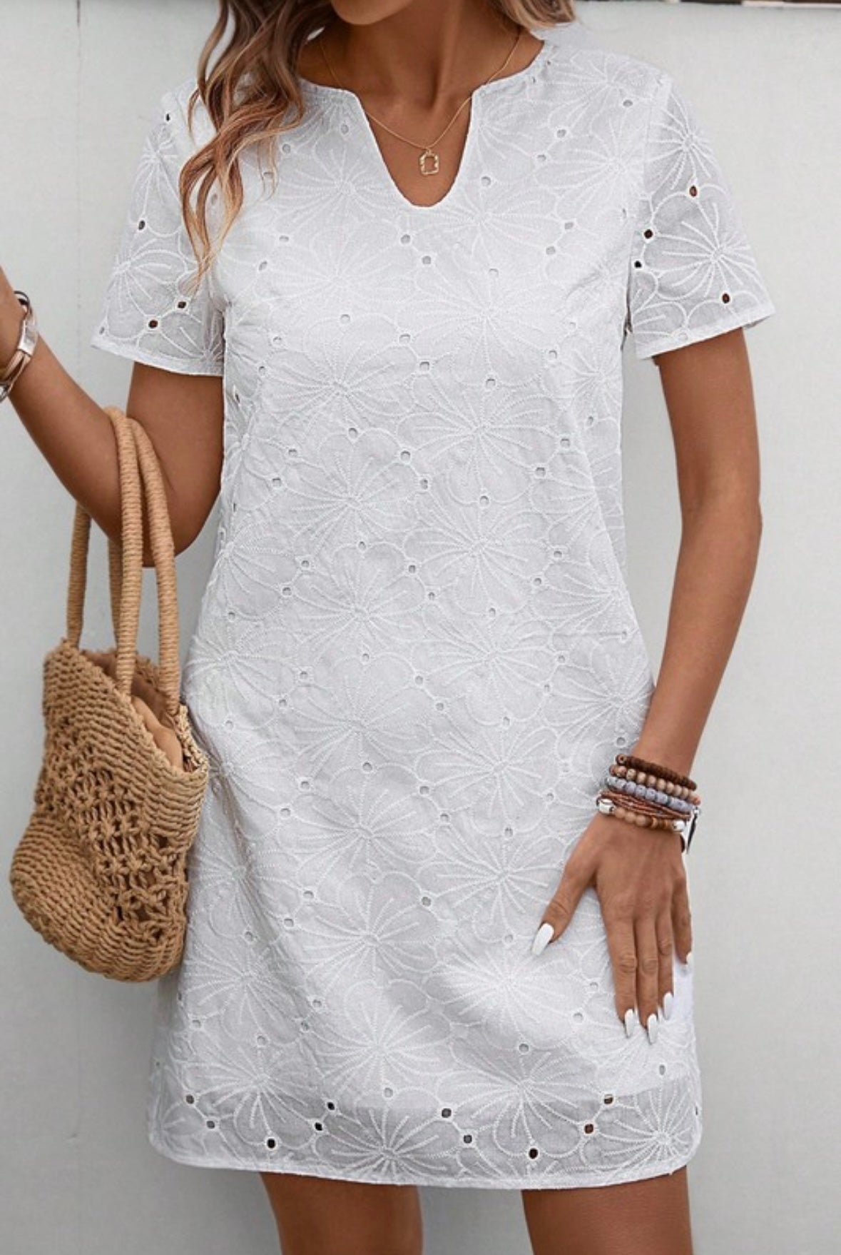 Lovely eyelet dress with pretty floral embroidery. Fully lined and not see-through. Has a snug fit.