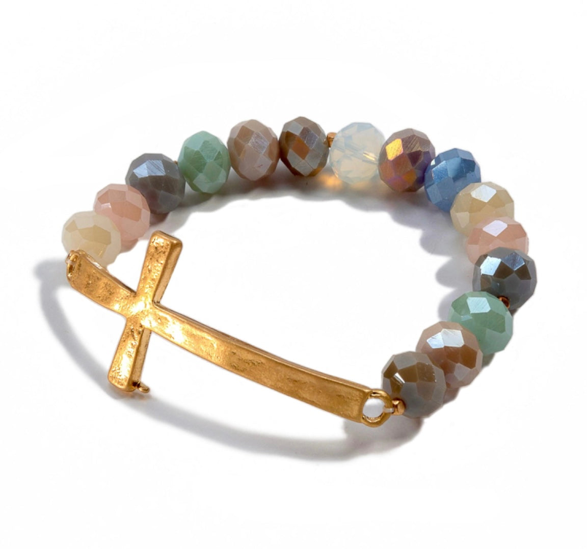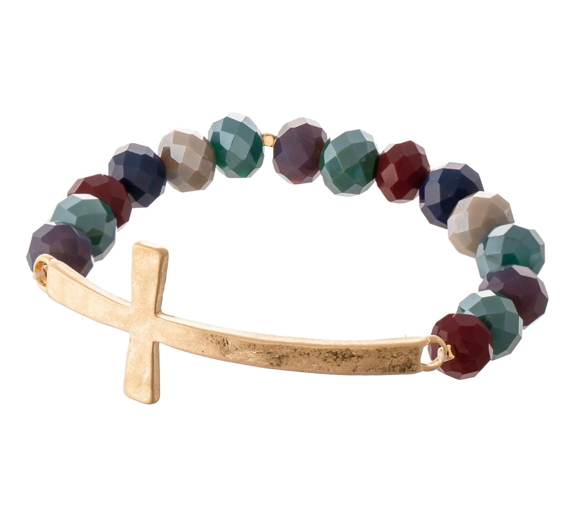 Facet Beaded Stretch Bracelet Featuring an East West Cross Focal.