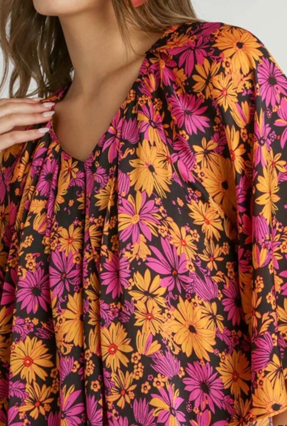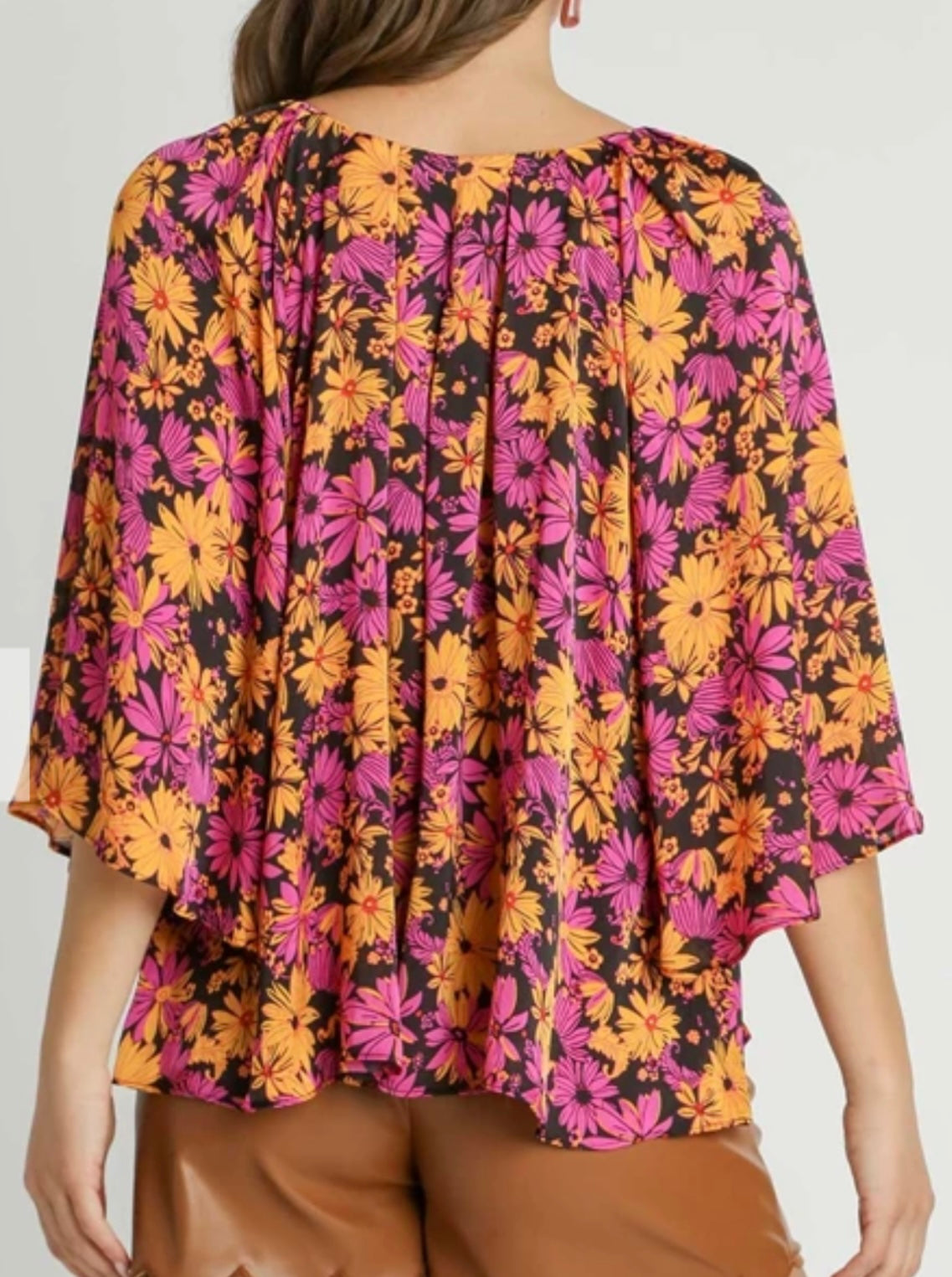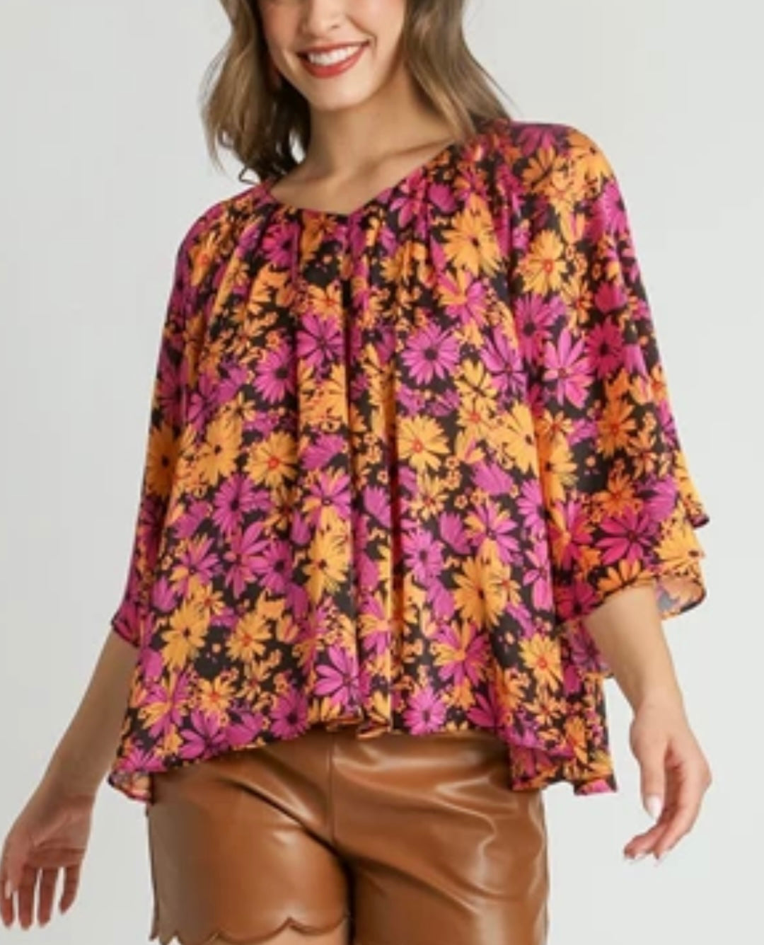 This oversized blouse features a floral print with a V-neckline and pleated detailing, complemented by elegant 3/4 length bell sleeves.