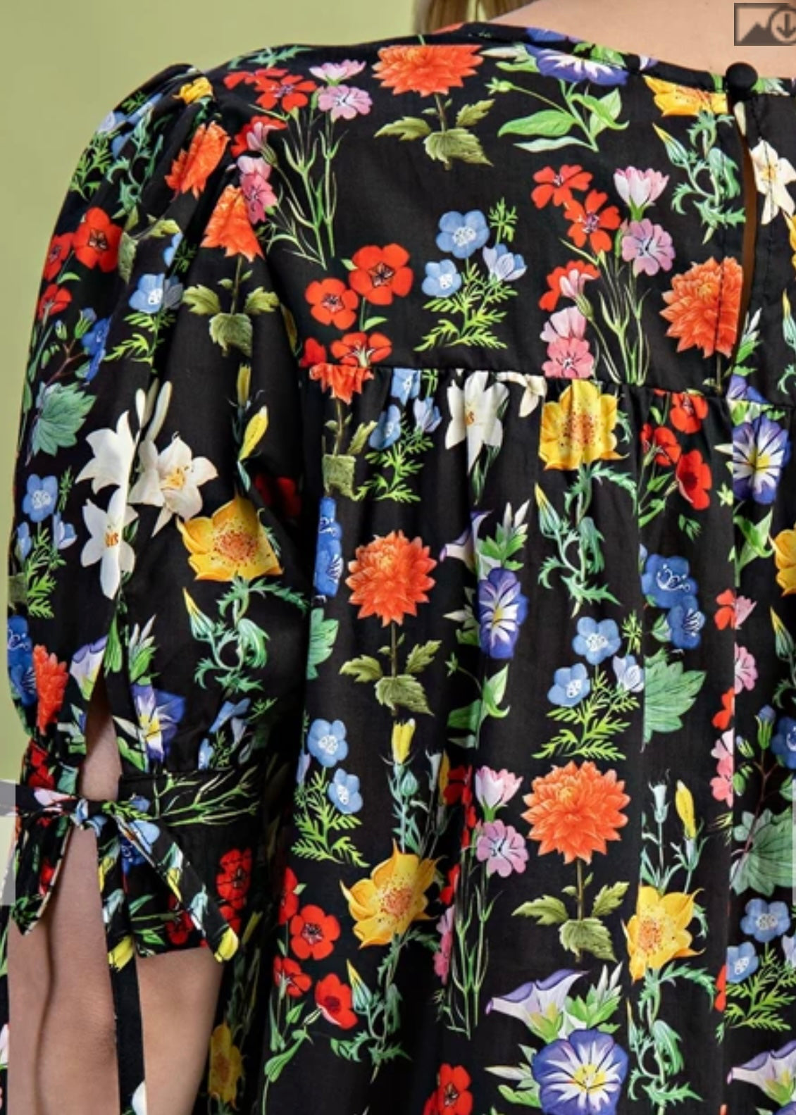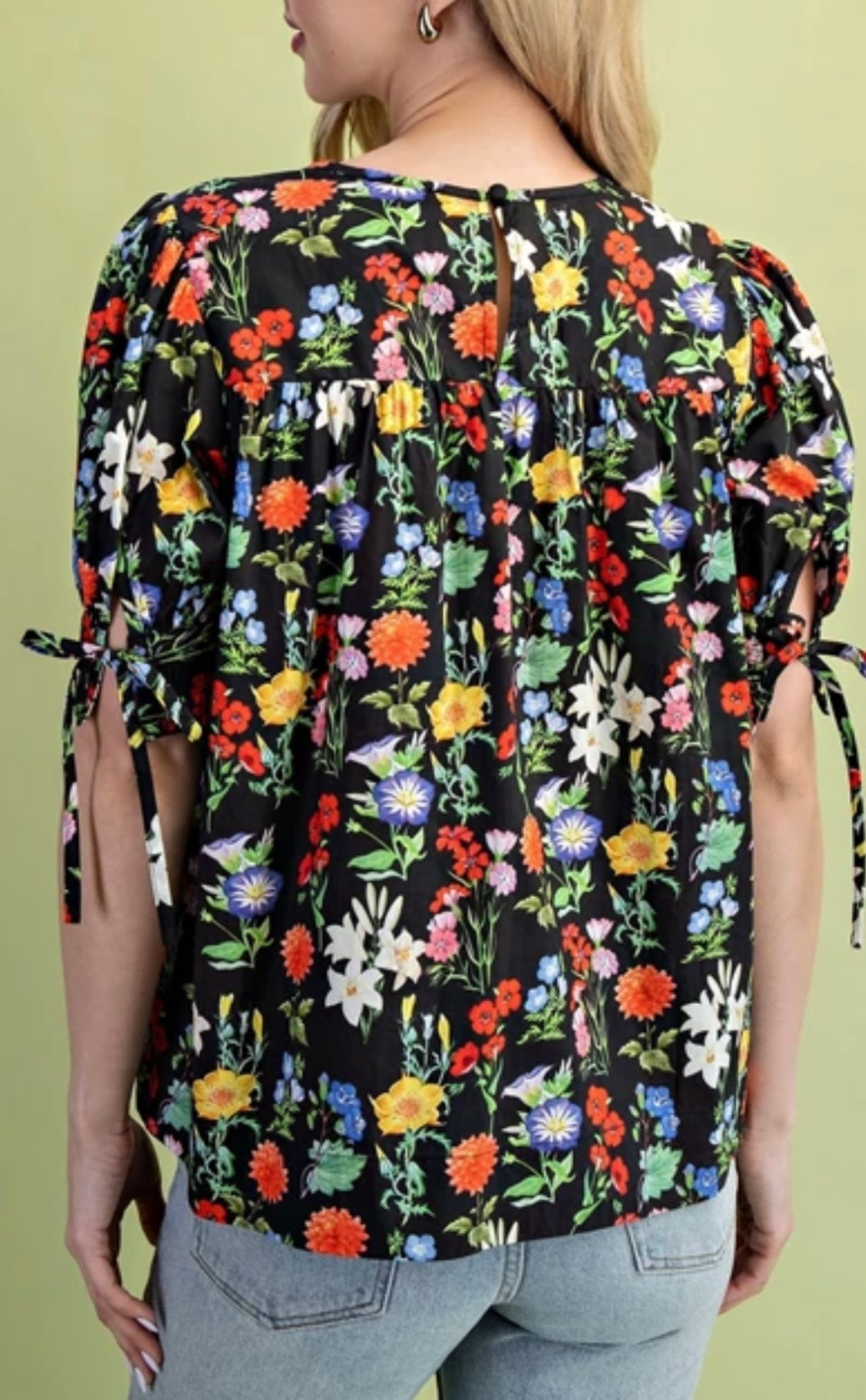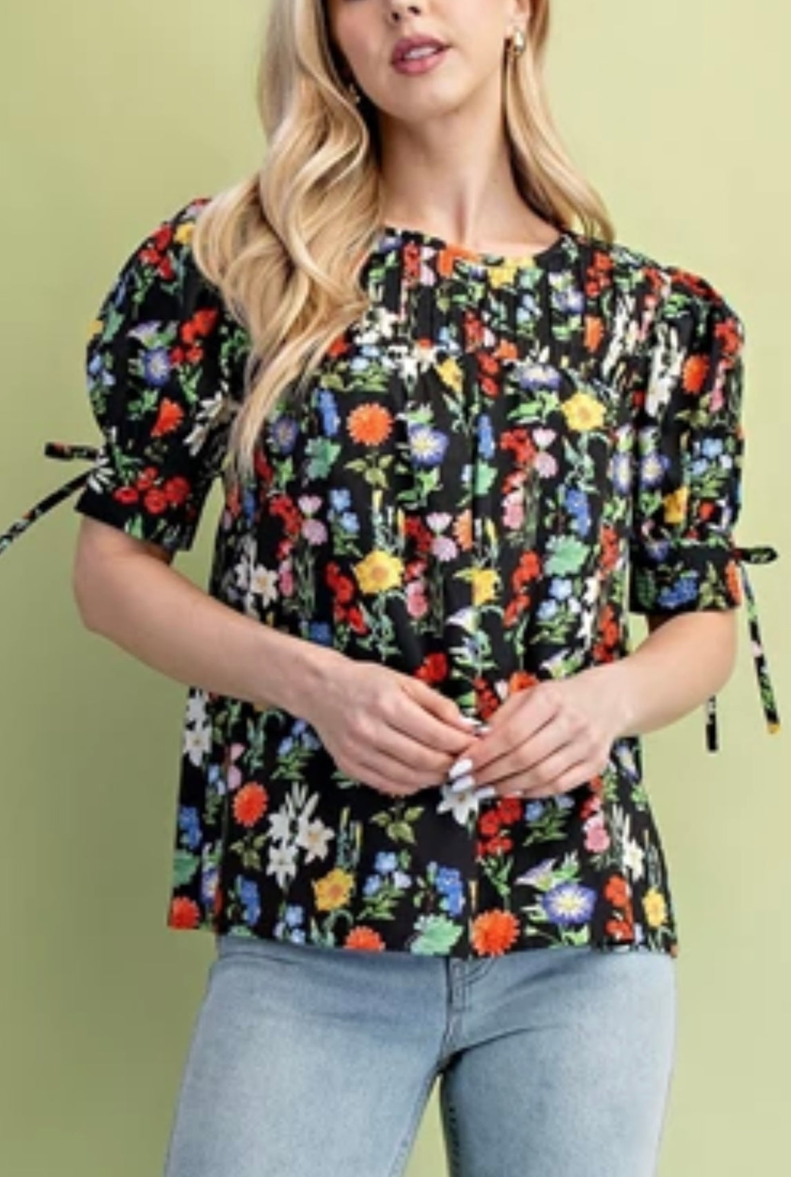 Colorful floral print woven blouse with pleats and tie sleeve details. Fits a bit relaxed but true in shoulders.
