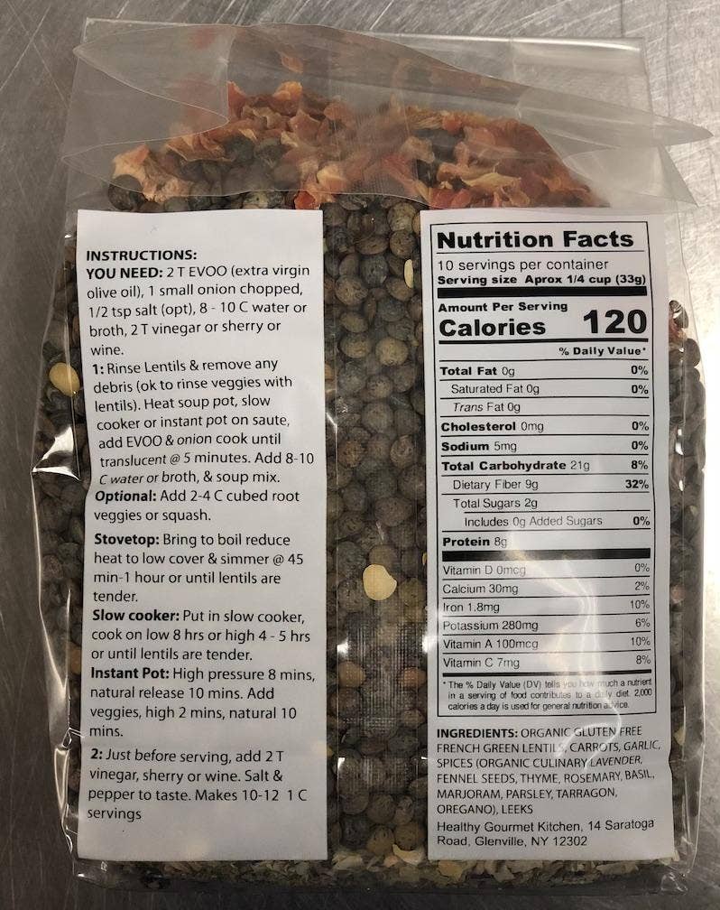 9 varieties of herbs and organic french green lentils make a hearty soup packed with flavor. Delicious hot or cold. Very easy soup to make and ready in 45 minutes. Makes ten one-cup servings, leftovers freeze beautifully. Vegan, vegetarian and naturally gluten-free. No added salt, sugar or MSG. No artificial preservatives.