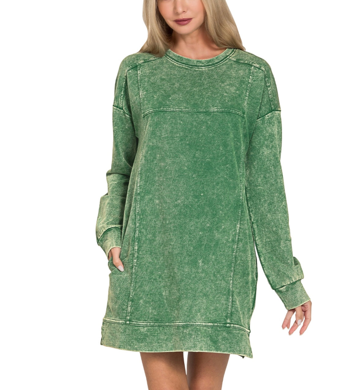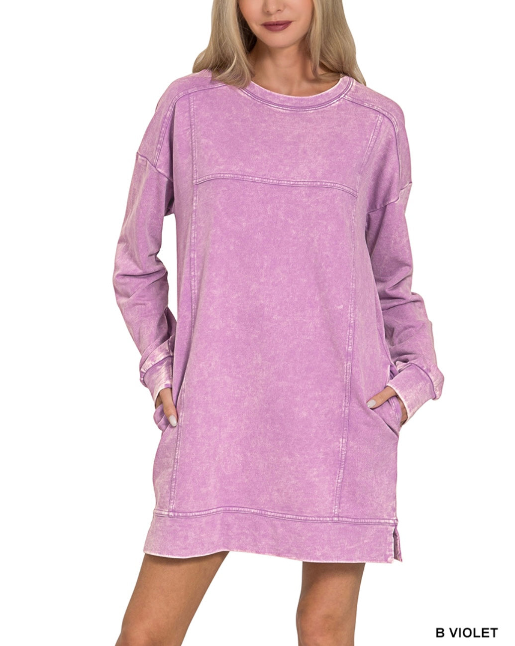 Meet your new go-to dress—soft French terry with a cool acid-washed vibe that makes every piece one-of-a-kind. No two are exactly alike, so you're guaranteed something special. Bonus: it has pockets! Runs true to size with a shorter length, perfect for pairing with your favorite sneakers or boots.