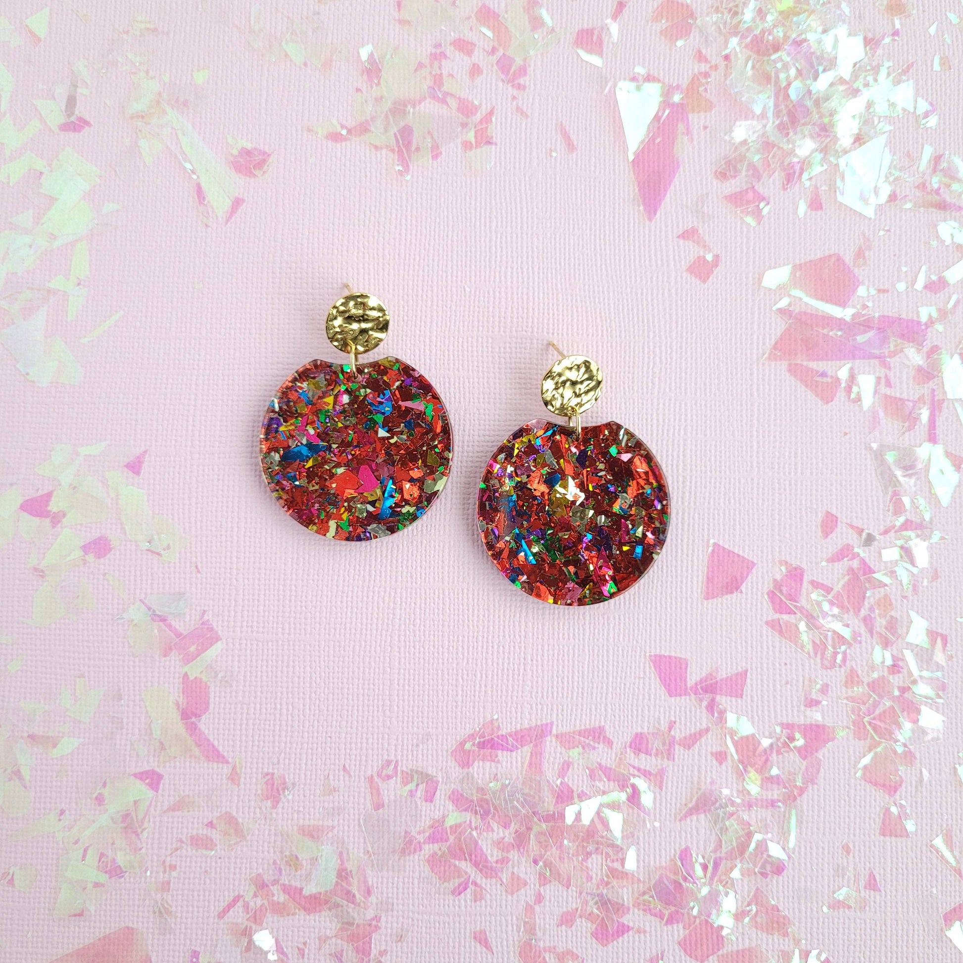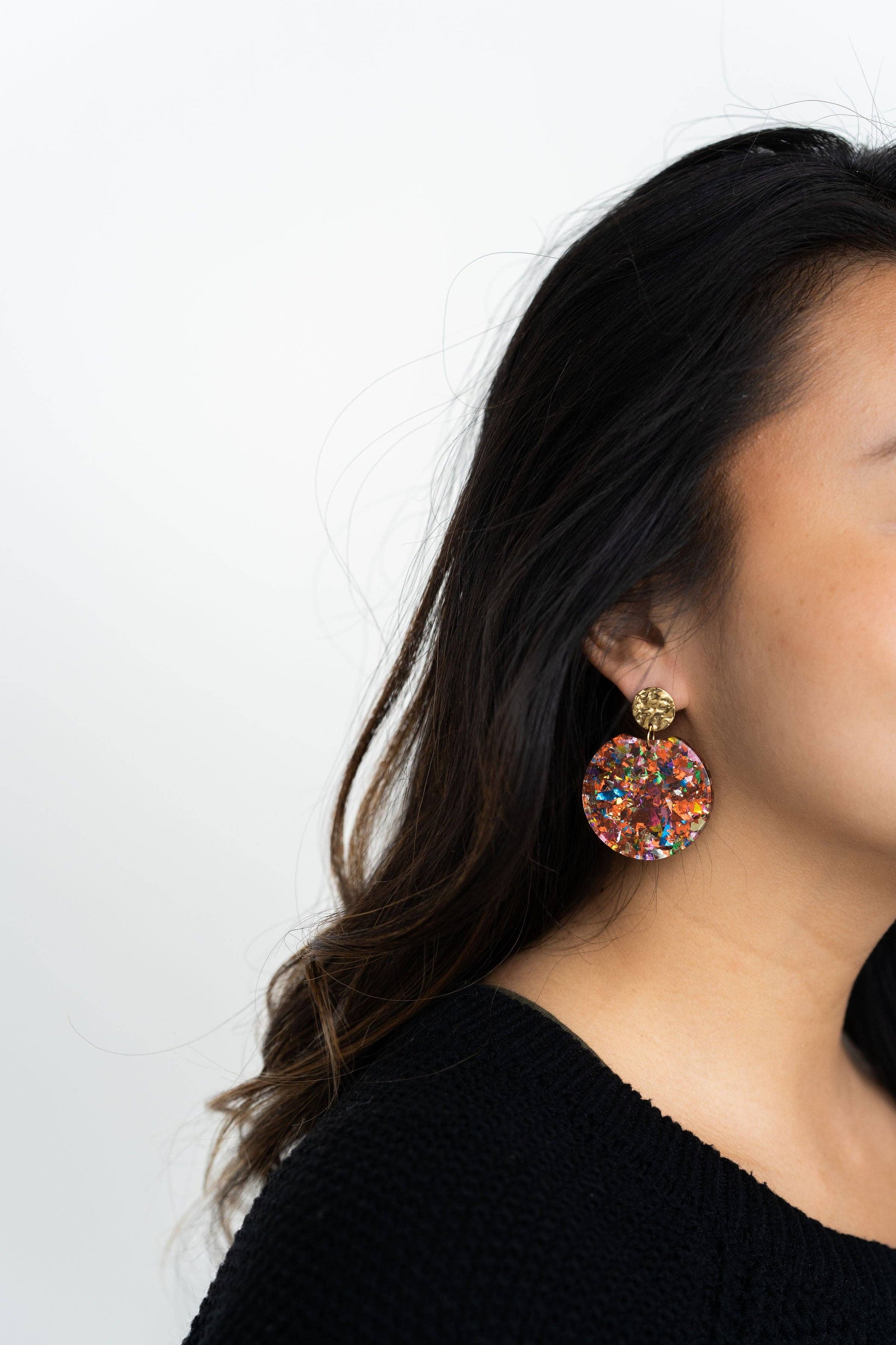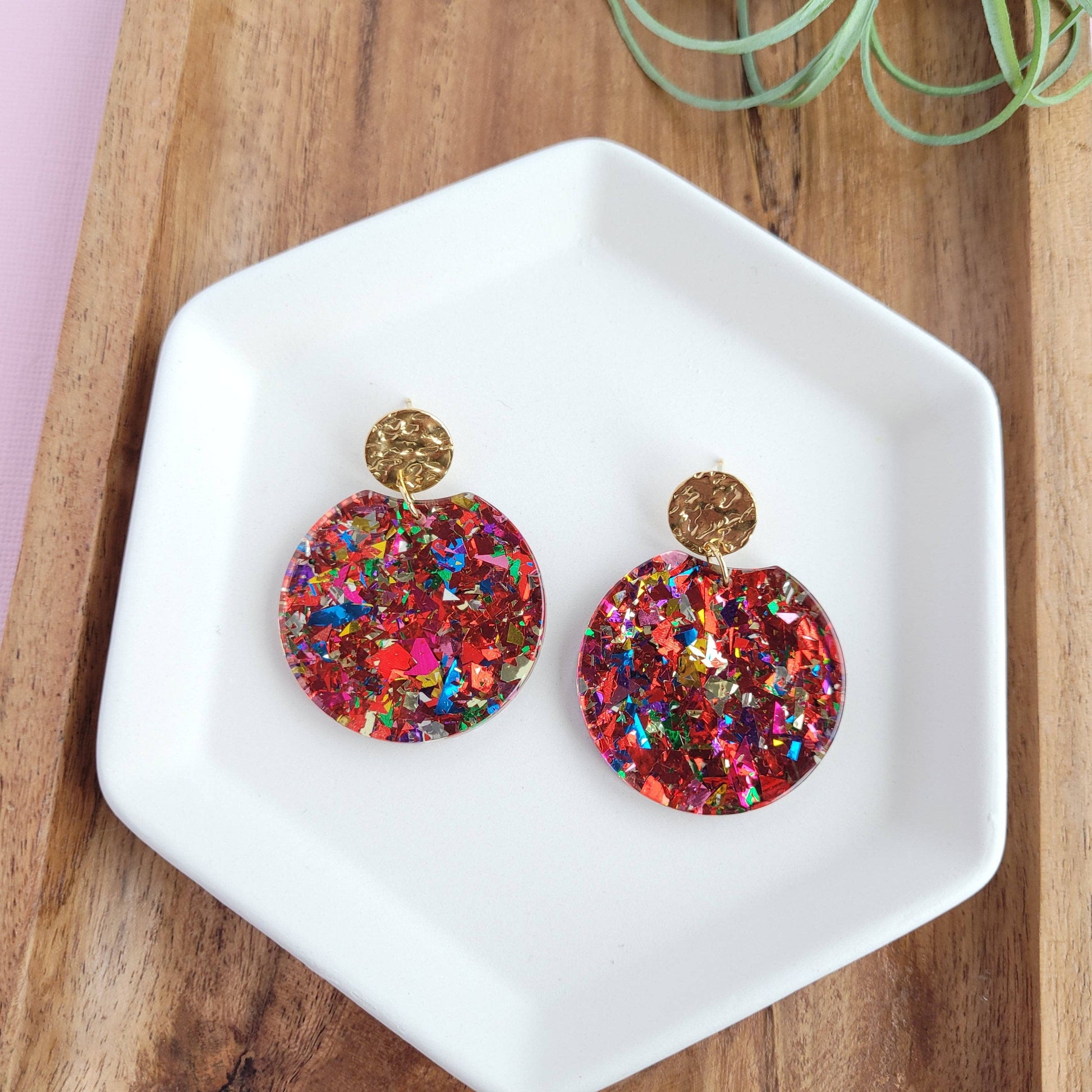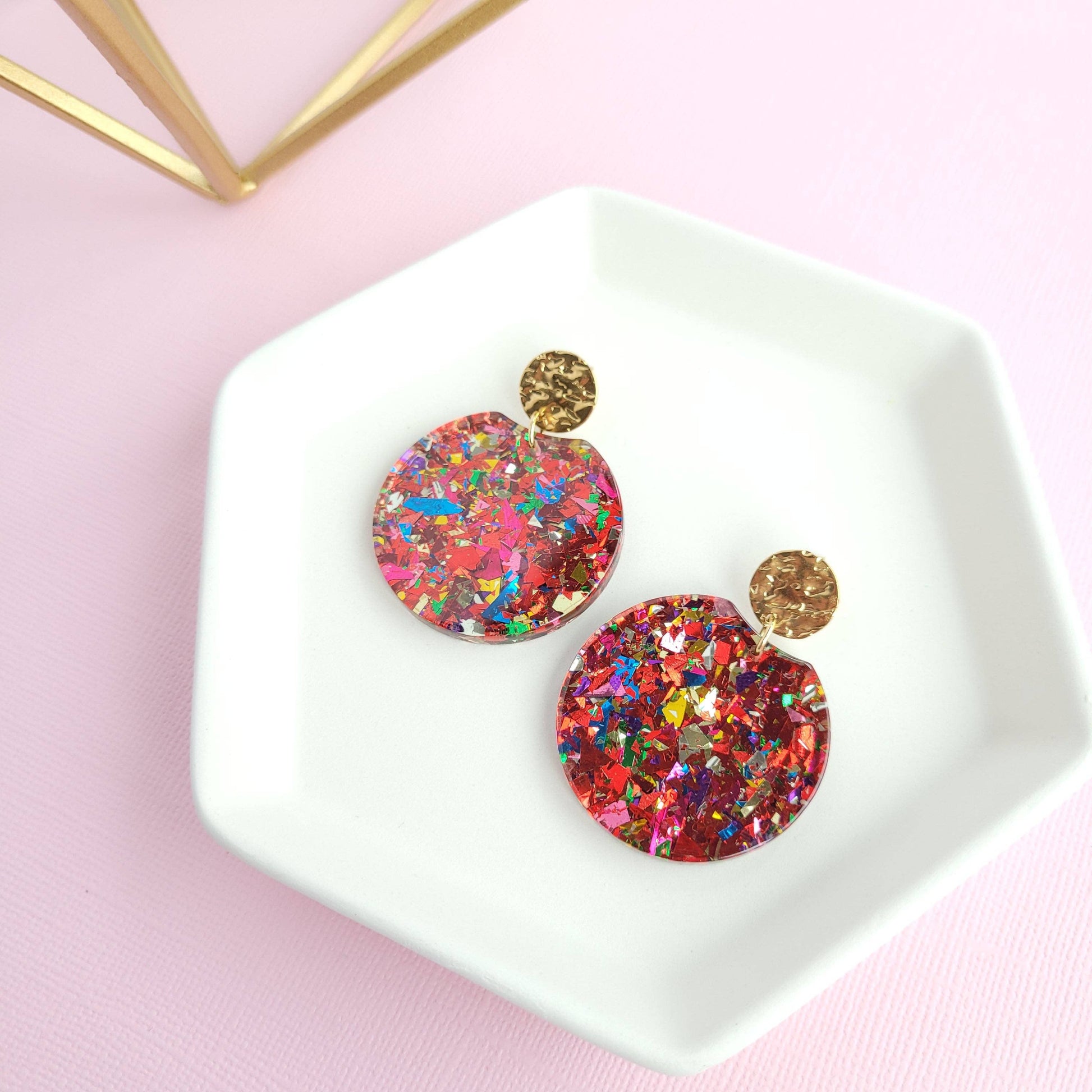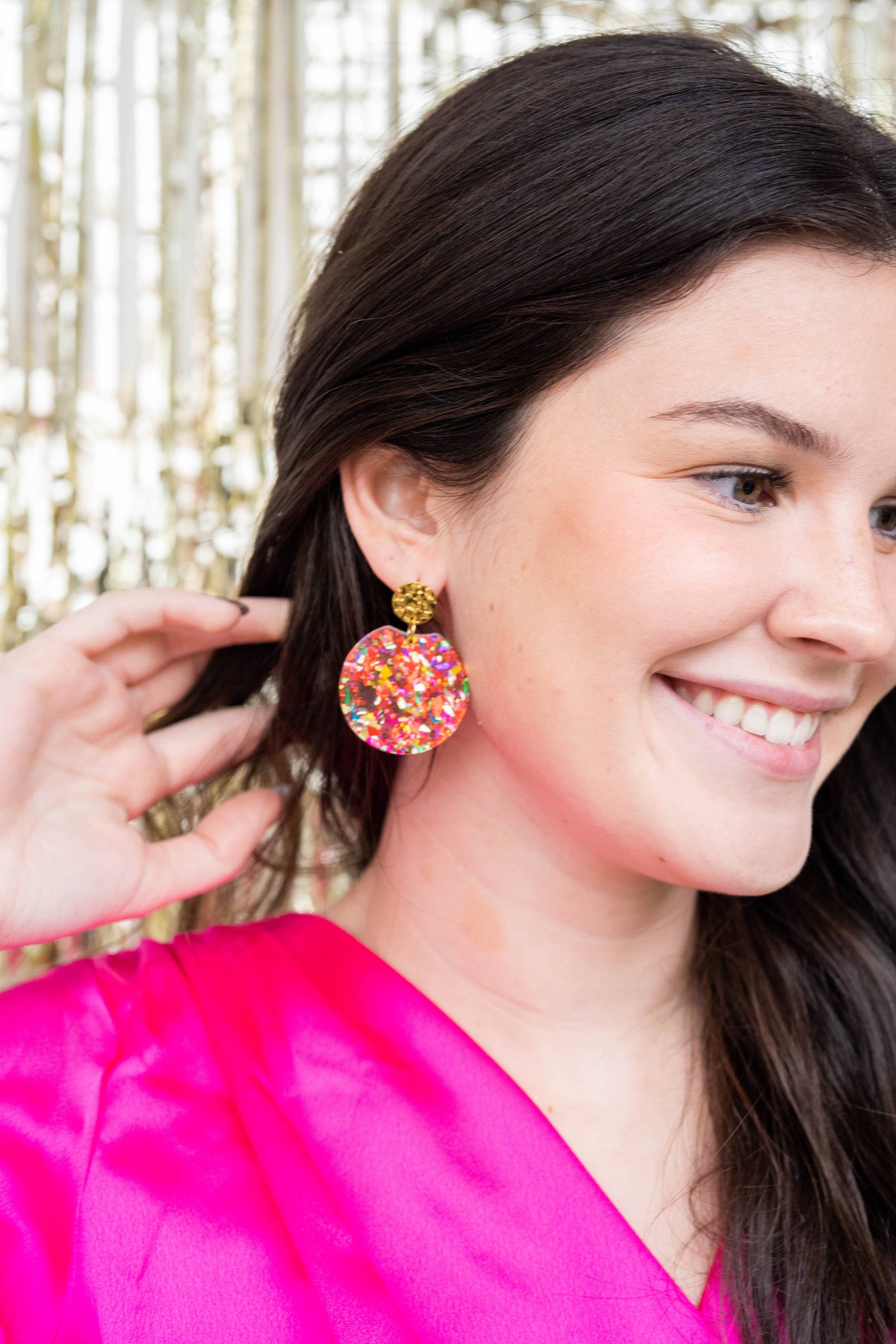 Gianna is a statement drop style with a fun acrylic charm full of sparkle. It is part of our Enchanted Collection full of glitter! * 18K gold-plated hypoallergenic stainless steel posts * 12mm posts * Lightweight and durable acrylic charms with confetti glitter in our enchanted fairy colorway