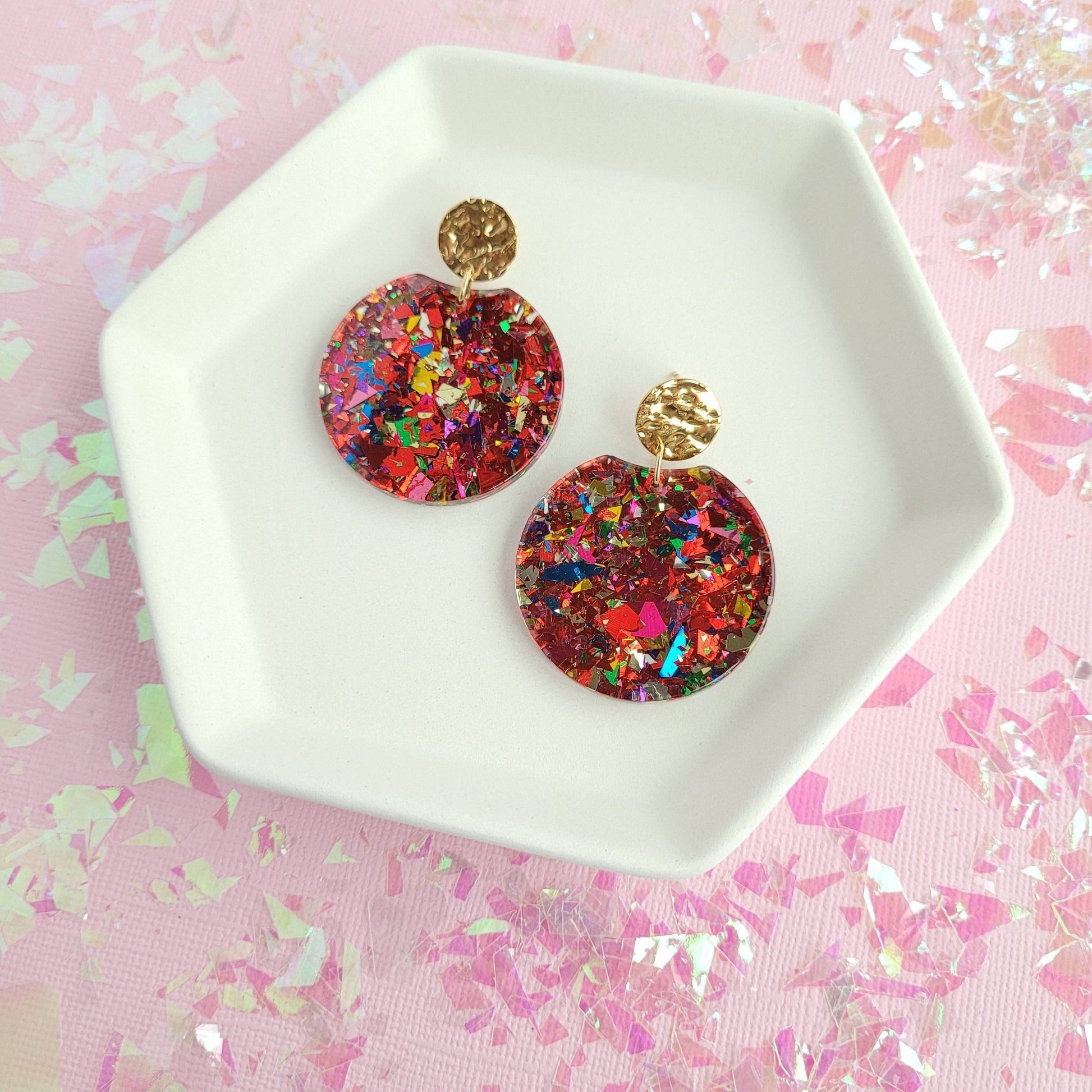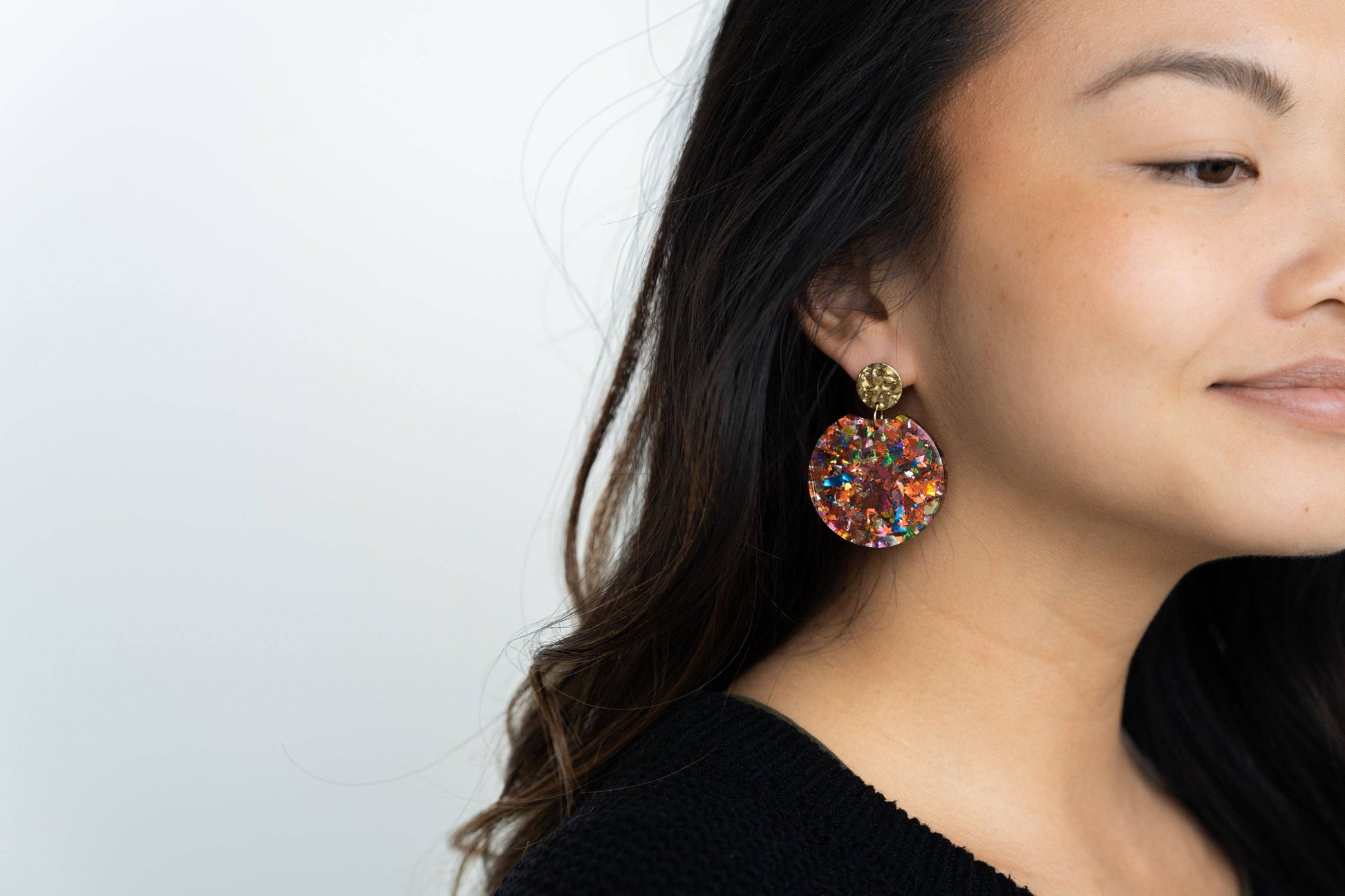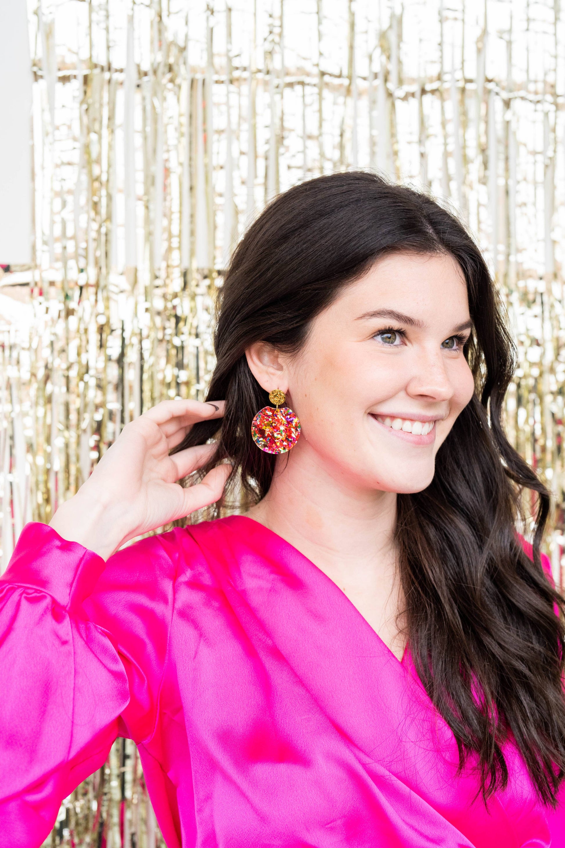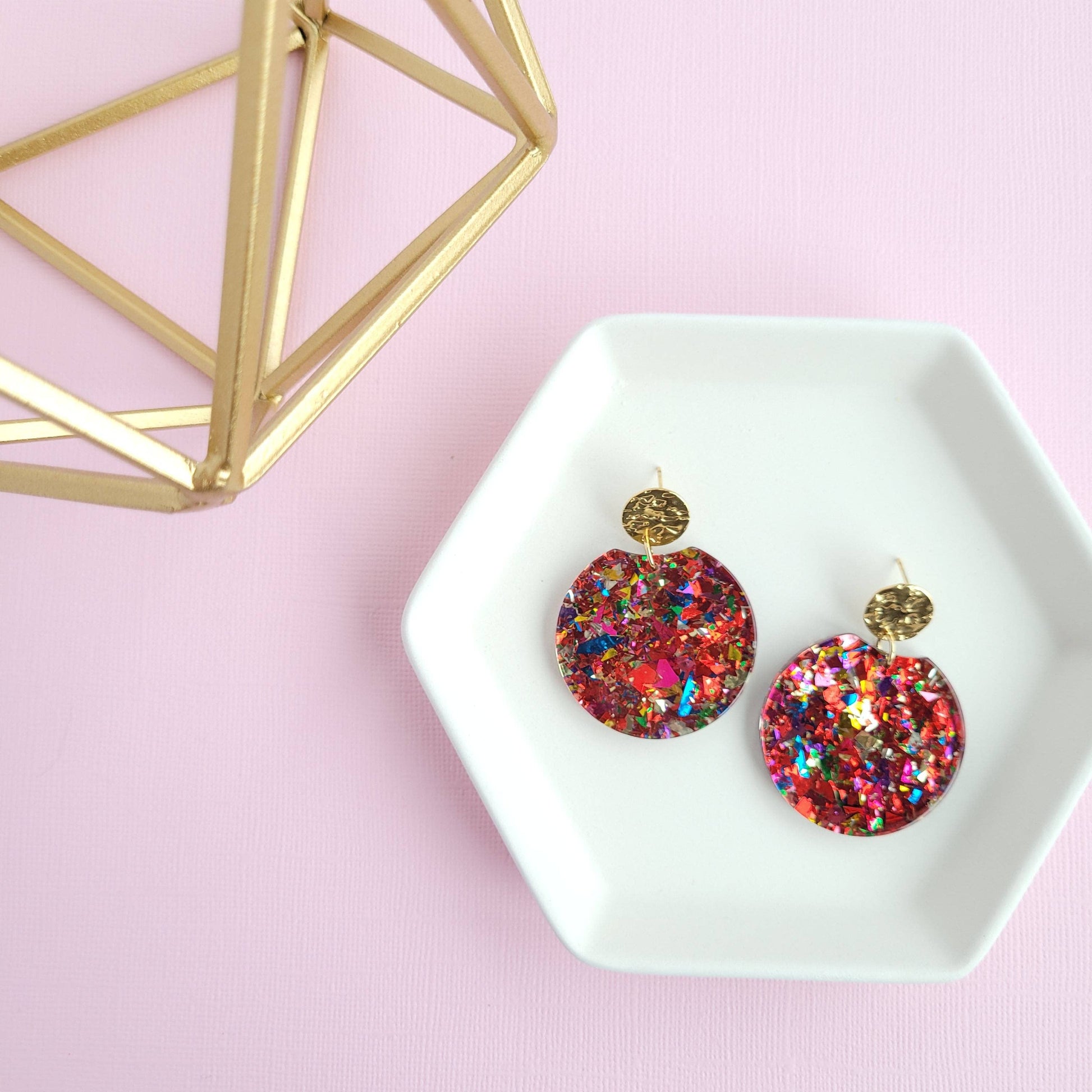 Gianna is a statement drop style with a fun acrylic charm full of sparkle. It is part of our Enchanted Collection full of glitter! * 18K gold-plated hypoallergenic stainless steel posts * 12mm posts * Lightweight and durable acrylic charms with confetti glitter in our enchanted fairy colorway