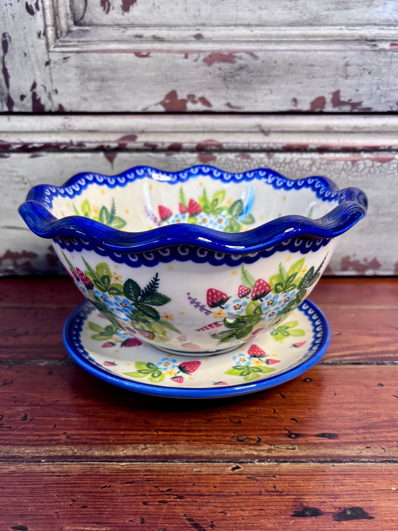 A beautiful 2 piece colander with strawberries and butterflies. Scalloped edge.