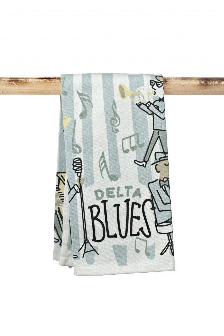 A tea towel featuring our Delta Blues design. Includes men playing various blues related musical instruments, musical notes and subtle blue stripes in the background– a perfect depiction of one of the earliest forms of blues music which originated in the great state of Mississippi.