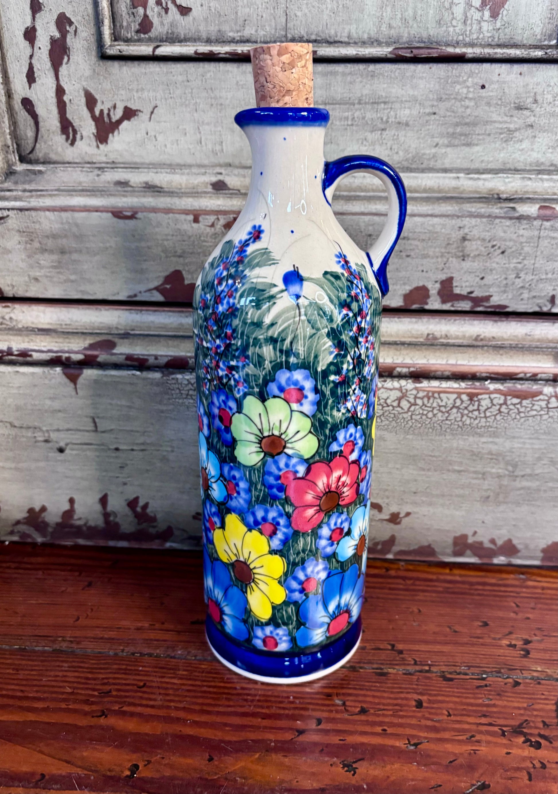 Stunning olive oil/ vinegar bottle that stands 10” tall and holds approximately 24oz.
