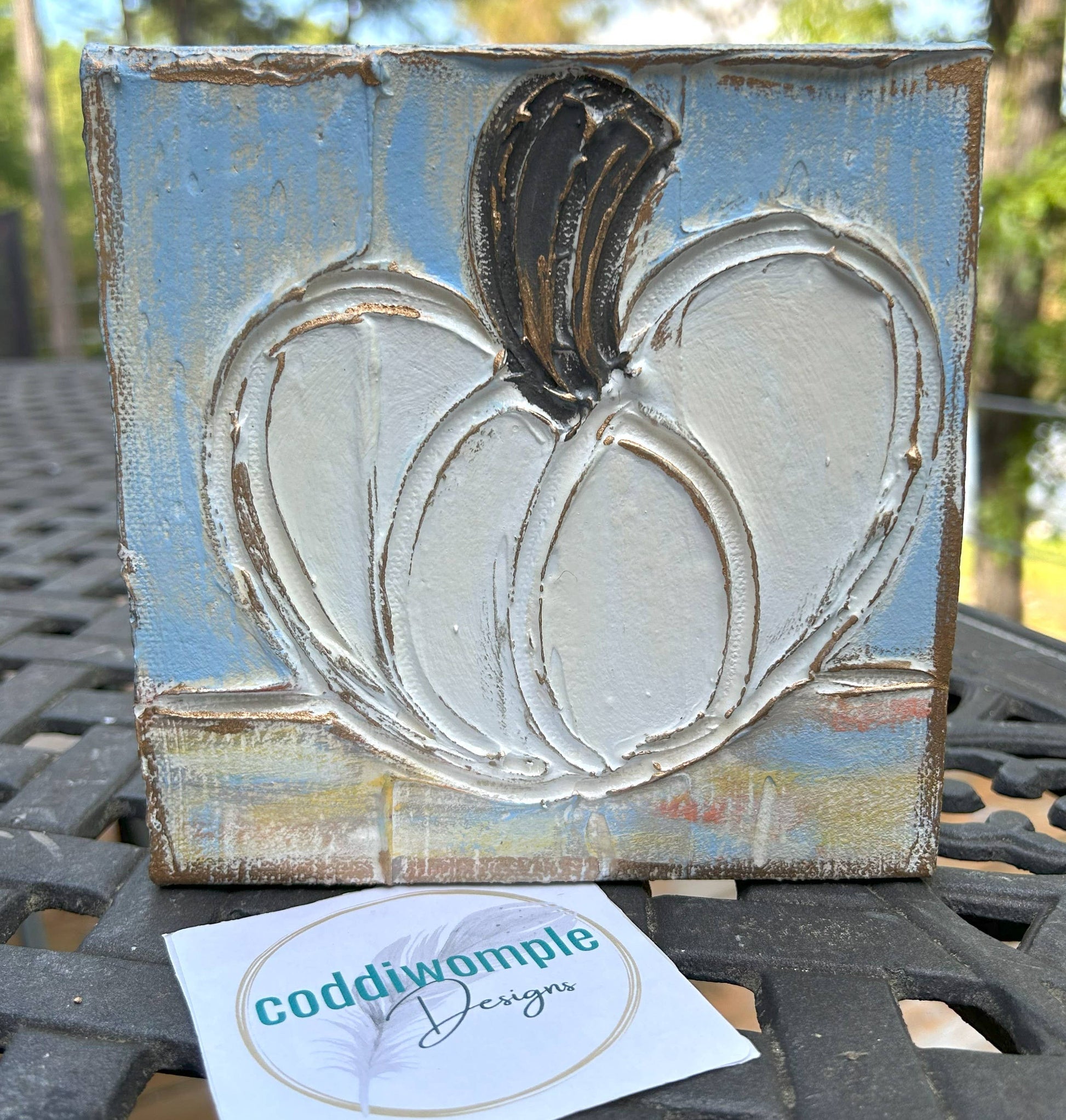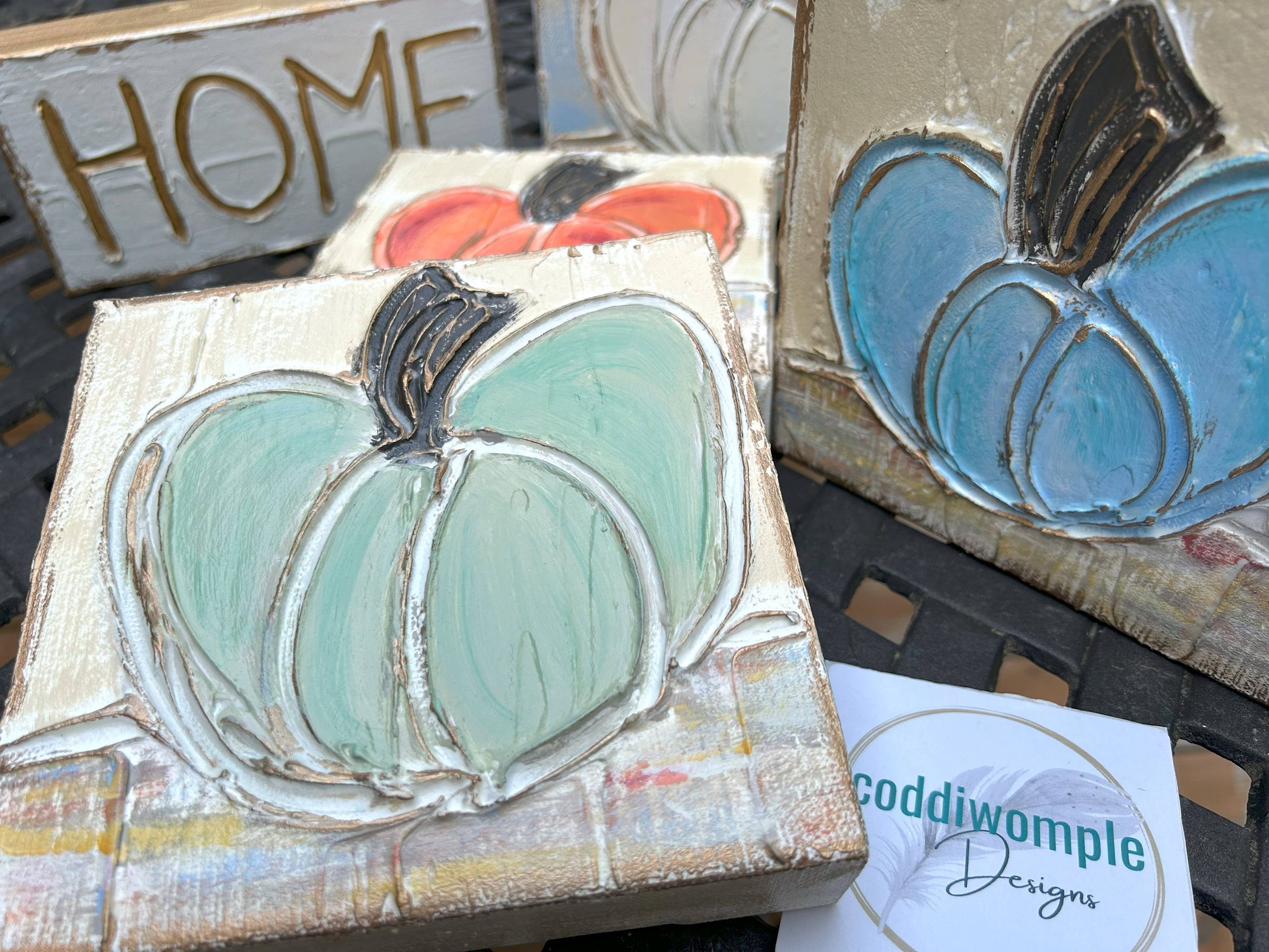 Create an elegant Autumn display wall or tablescape for indoor or covered outdoor areas with these 6x6 pumpkins on gallery canvas. Artist signature and company name are included on the back. Because each design is individually drawn and textured, the art on each block and canvas is unique and will vary slightly.
