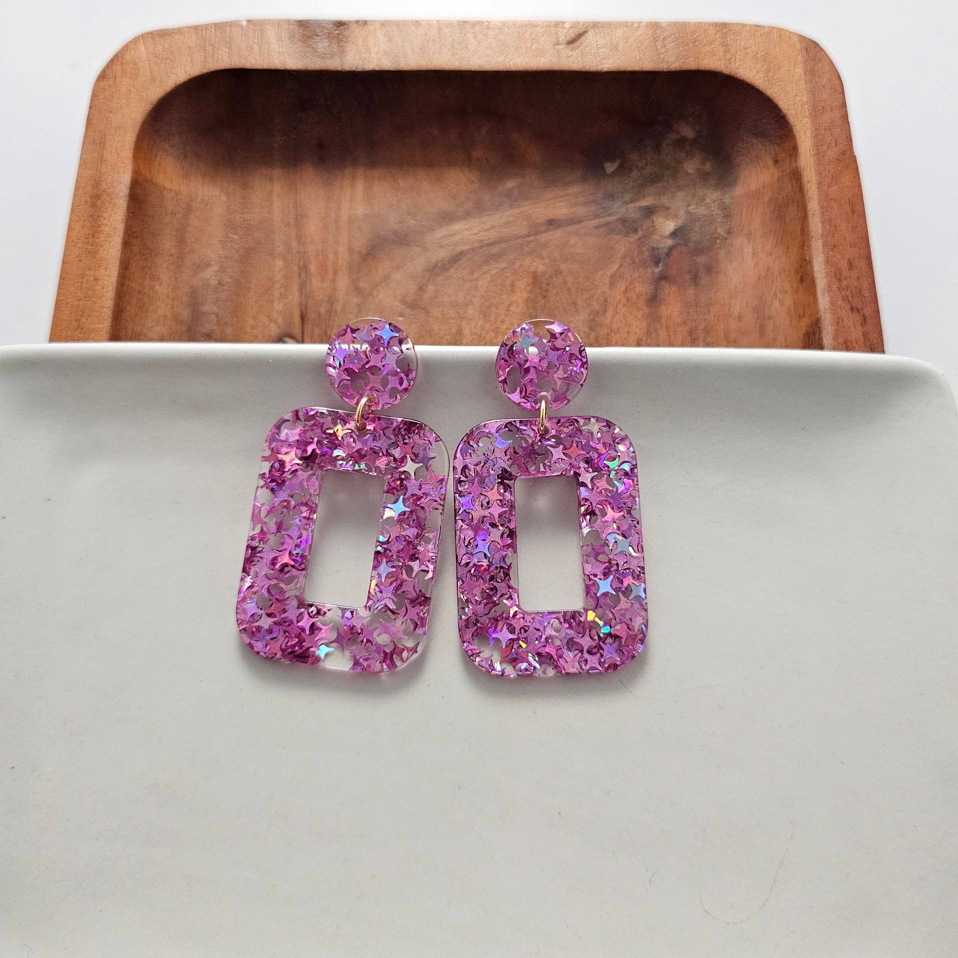 Our Margot Earrings are a bold statement with a hint of glamorous flair. The acrylic rectangle earrings add contemporary style to any outfit, while the matching posts and charms will make you feel effortlessly chic. * Hypoallergenic stainless steel posts * 15mm stud size * Lightweight and durable pink glitter acrylic