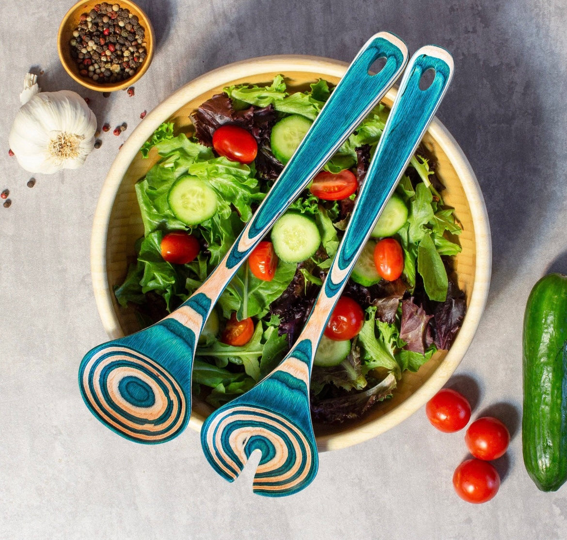 The Mykonos collection offers cool Mediterranean style with swirls of the inviting teal shades of the sea. It's a rich, awe-inspiring look never before seen in cooking utensils. This salad serving utensil set is uniquely designed to easily grab salad for tossing and serving.