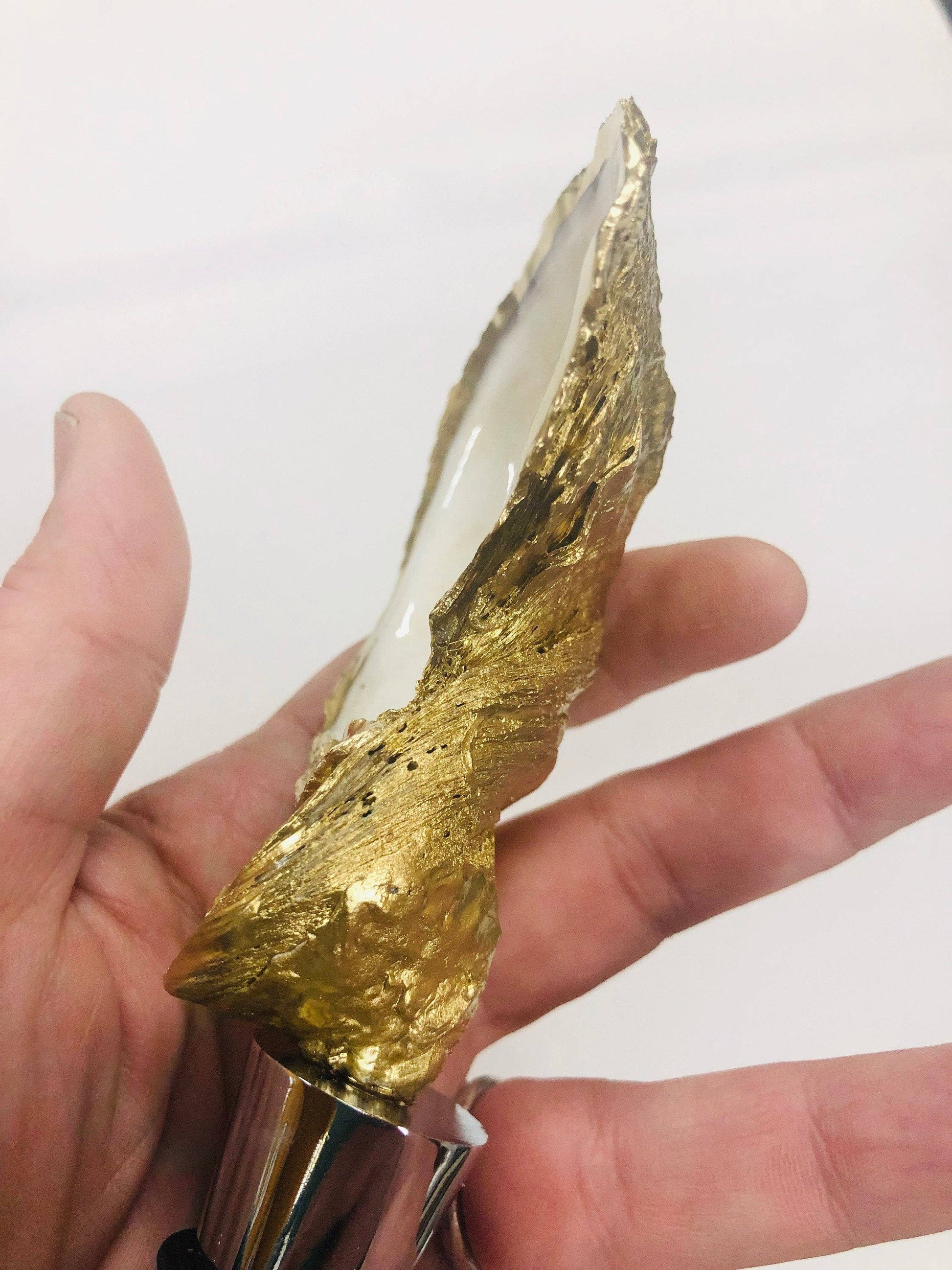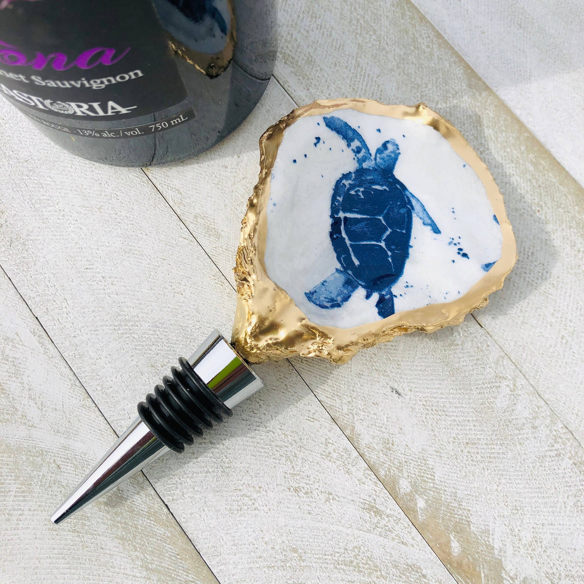 Oyster Wine Stopper--Sea Turtle. A unique addition to your decor for any wine lover! An embellished natural oyster shell sits atop a stainless steel and silicone wine stopper and will add a little coastal flair to your next get together. Each stopper is made to order and would make a great hostess, wedding, or all occasion gift! Shells are natural and vary in size, shape and color of their interior. They typically range from 3-4.5 inches long and 2-3 inches wide. Interior of shell is decoupaged with a swimming sea turtle print and sealed in a gloss clear varnish with a gold rim. Backside of shell is gold enamel. Care and cleaning instructions: Shell can be unscrewed from the stainless steel stopper.
