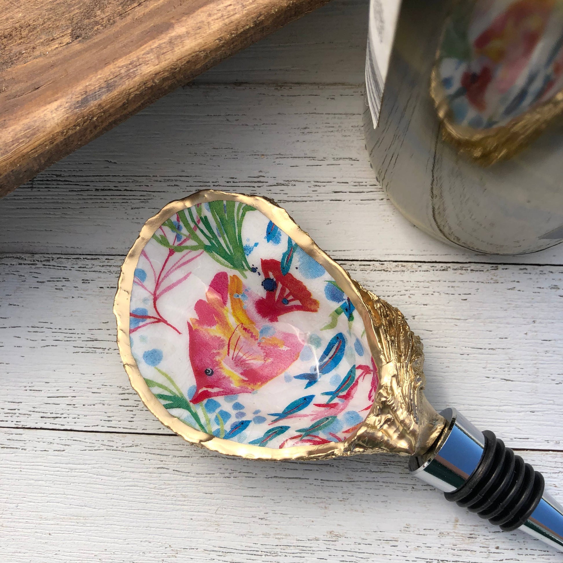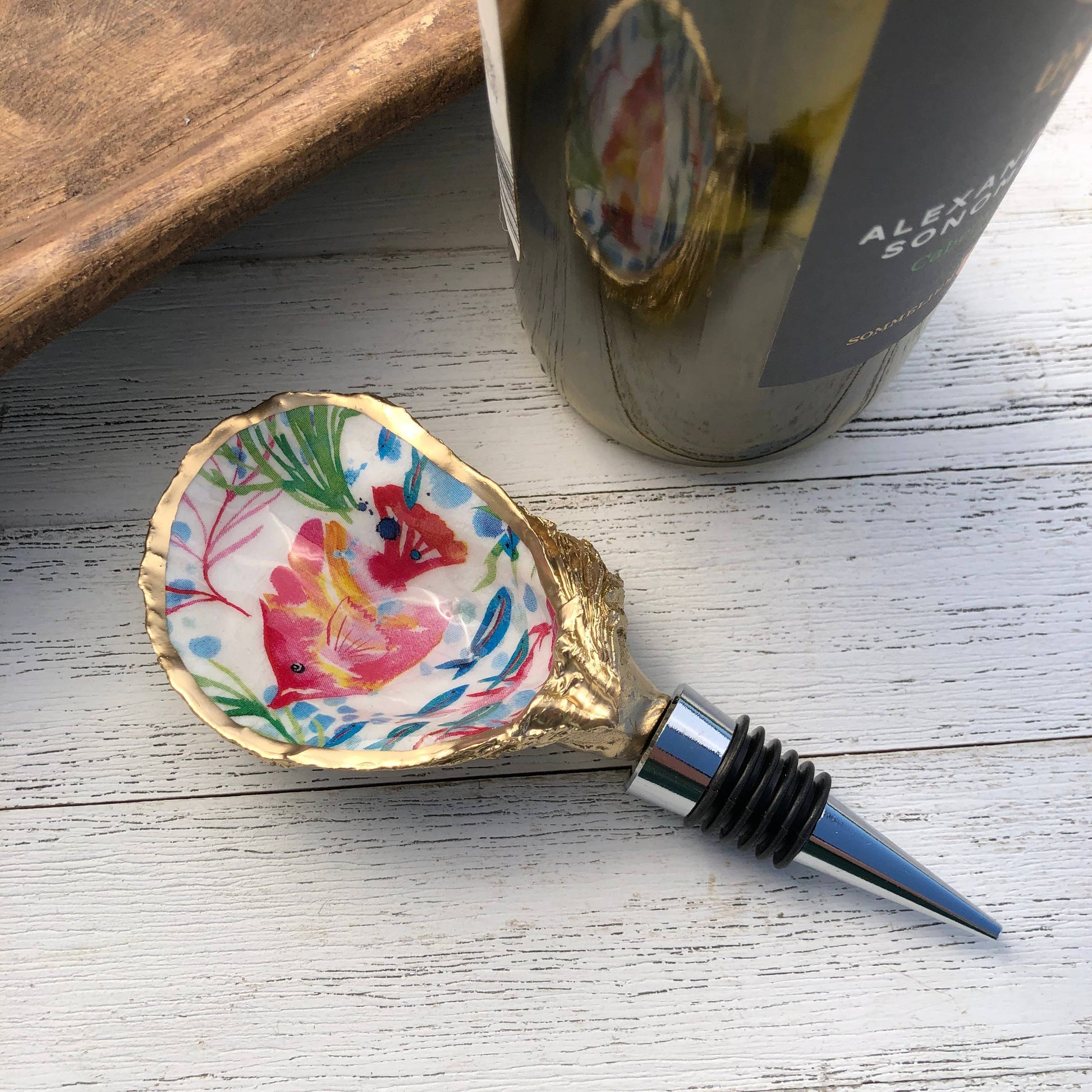 Oyster Wine Stopper--Tropical Fish design. A unique addition to your decor for any wine lover! A gold embellished natural oyster shell sits atop a stainless steel and silicone wine stopper and will add a little coastal flair to your next get together. Each stopper is made to order and would make a great hostess, wedding, or all occasion gift! Shells are natural and vary in size, shape and color of their interior. They typically range from 3-4.5 inches long and 2-3 inches wide. Interior of shell is left its natural color and sealed in a gloss clear varnish with a gold rim. Backside of shell is gold enamel. Care and cleaning instructions: Shell can be unscrewed from the stainless steel stopper.