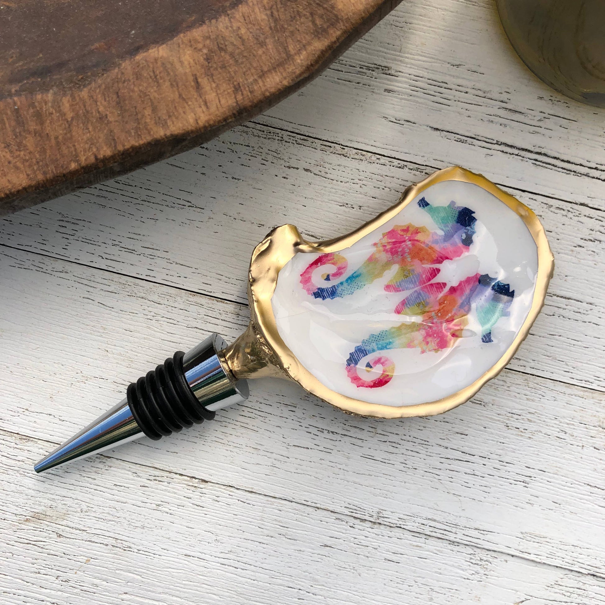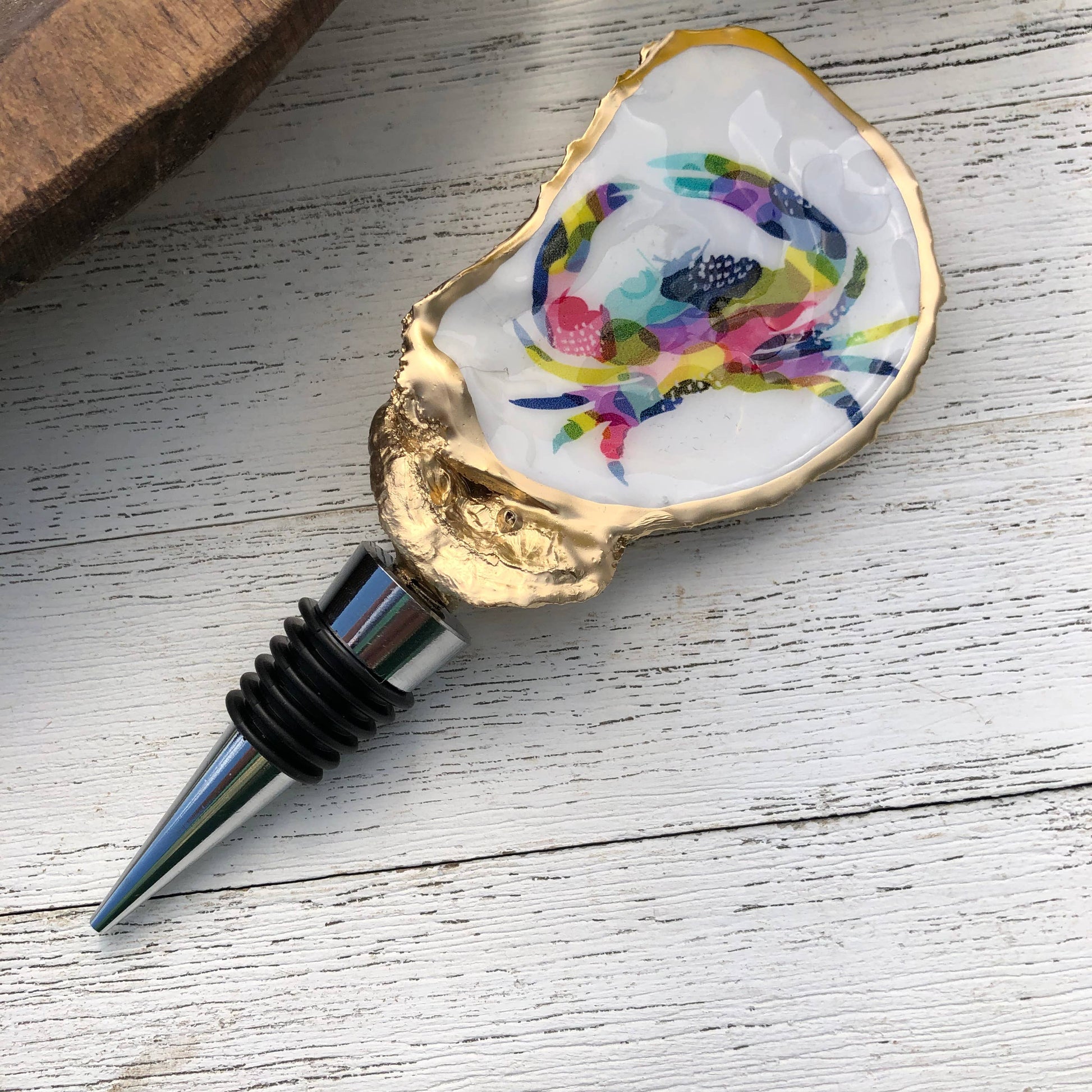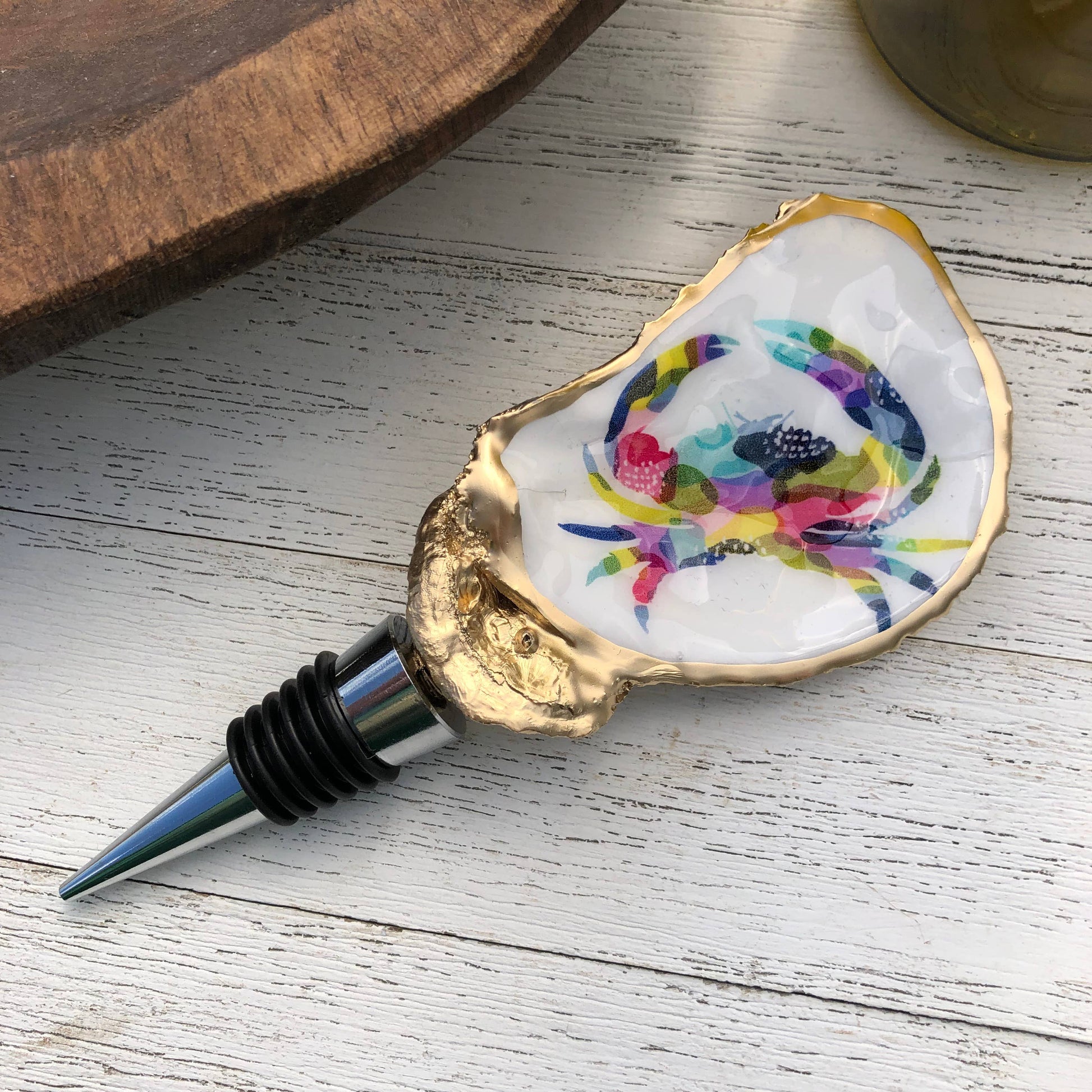 Oyster Wine Stopper--Watercolor Crab. A unique addition to your decor for any wine lover! A gold embellished natural oyster sits atop a stainless steel and silicone wine stopper and will add a little coastal flair to your next get together. Each stopper is made to order and would make a great hostess, wedding, or all occasion gift! These are natural and vary in size, shape and color of their interior. They typically range from 3-4.5 inches long and 2-3 inches wide. Interior of shell is left its natural color and sealed in a gloss clear varnish with a gold rim. Backside is gold enamel. Care and cleaning instructions: Oyster can be unscrewed from the stainless steel stopper.