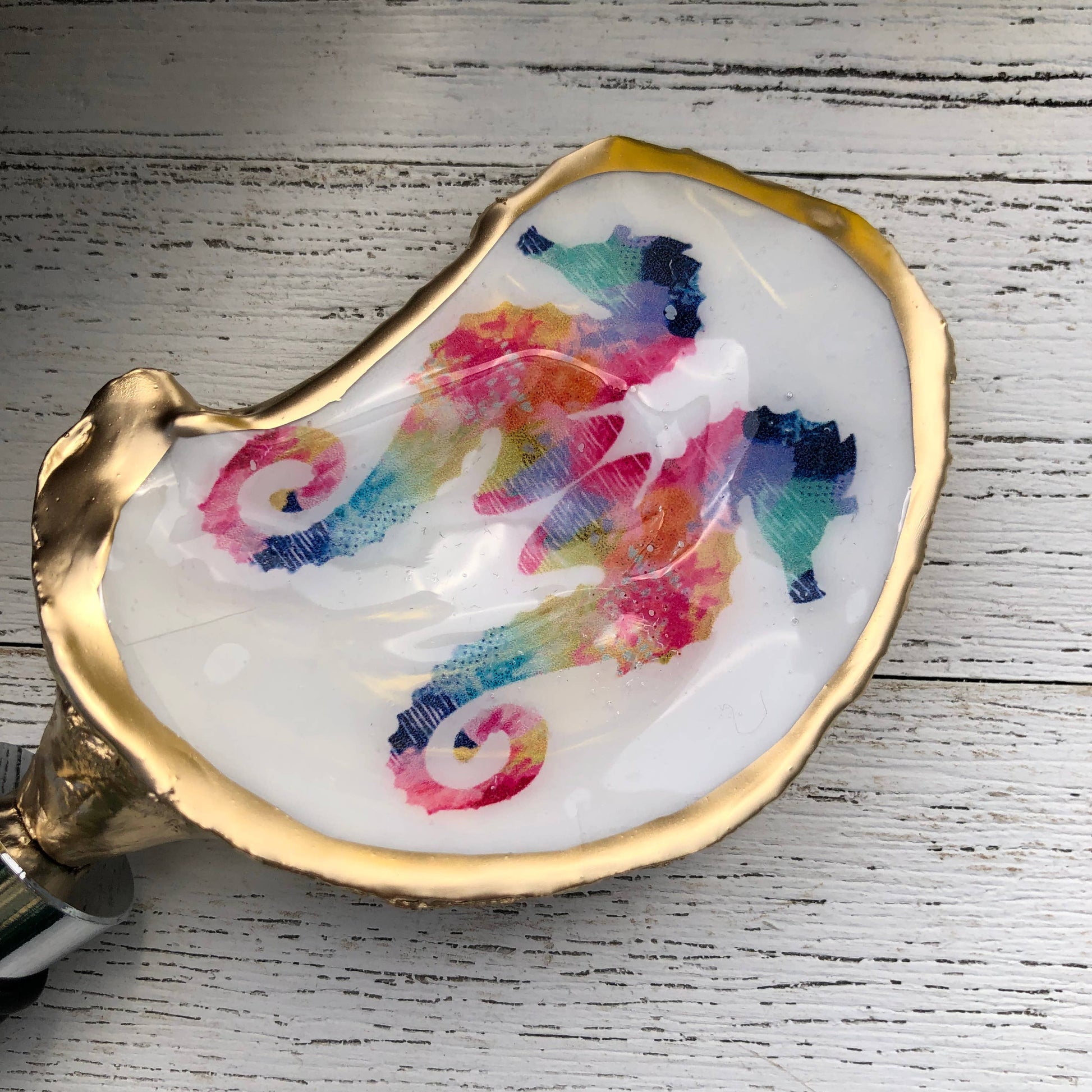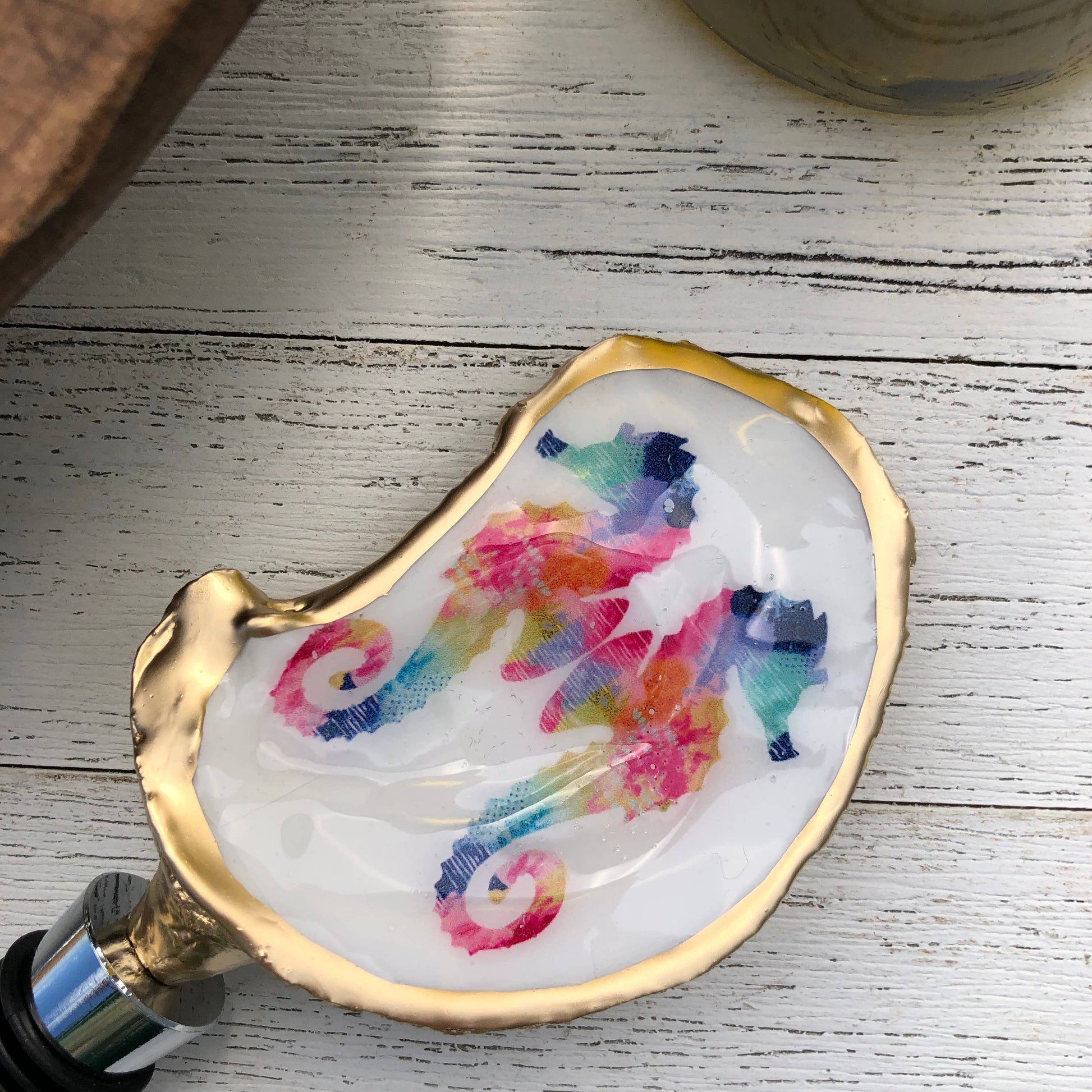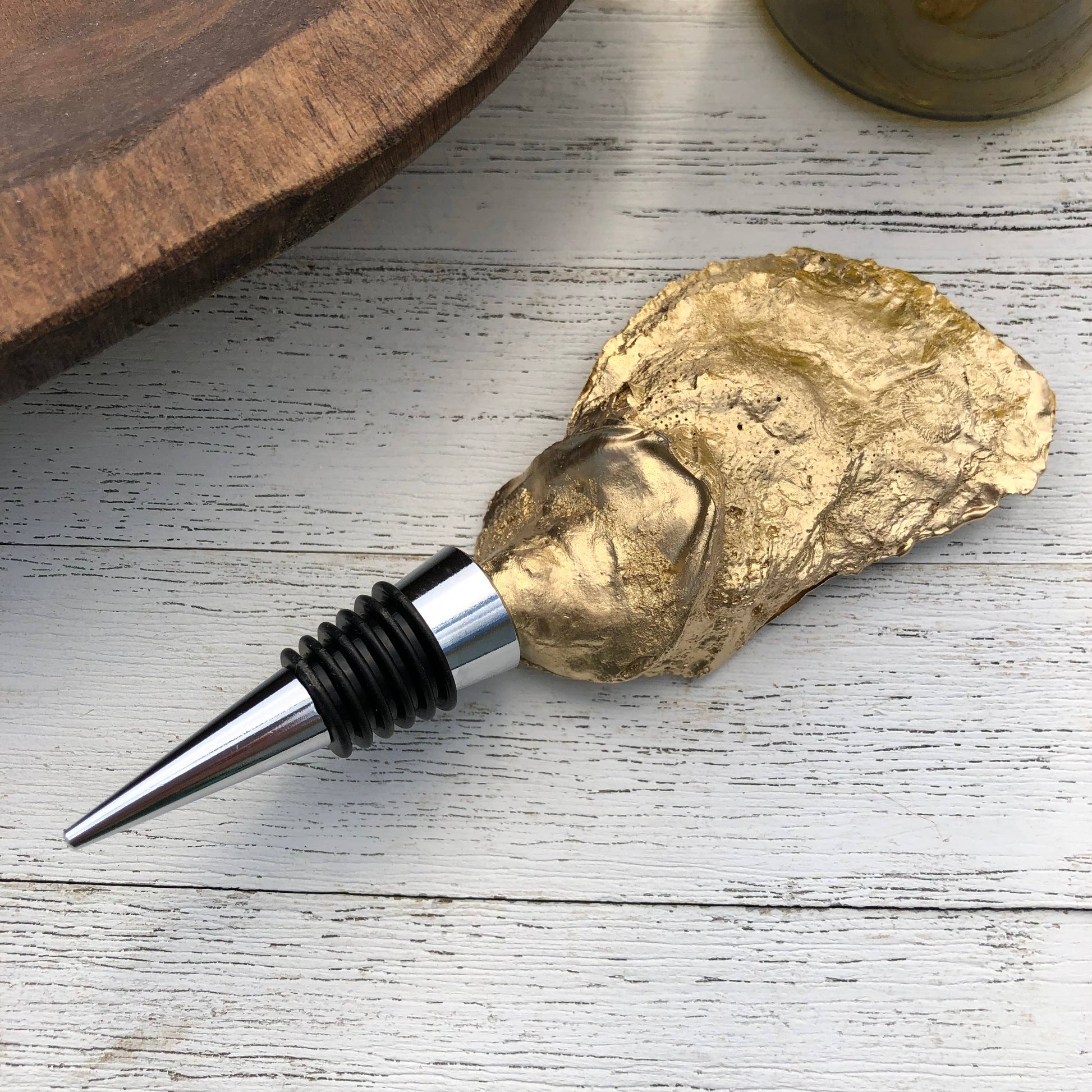 Oyster Wine Stopper--Watercolor Crab. A unique addition to your decor for any wine lover! A gold embellished natural oyster sits atop a stainless steel and silicone wine stopper and will add a little coastal flair to your next get together. Each stopper is made to order and would make a great hostess, wedding, or all occasion gift! These are natural and vary in size, shape and color of their interior. They typically range from 3-4.5 inches long and 2-3 inches wide. Interior of shell is left its natural color and sealed in a gloss clear varnish with a gold rim. Backside is gold enamel. Care and cleaning instructions: Oyster can be unscrewed from the stainless steel stopper.