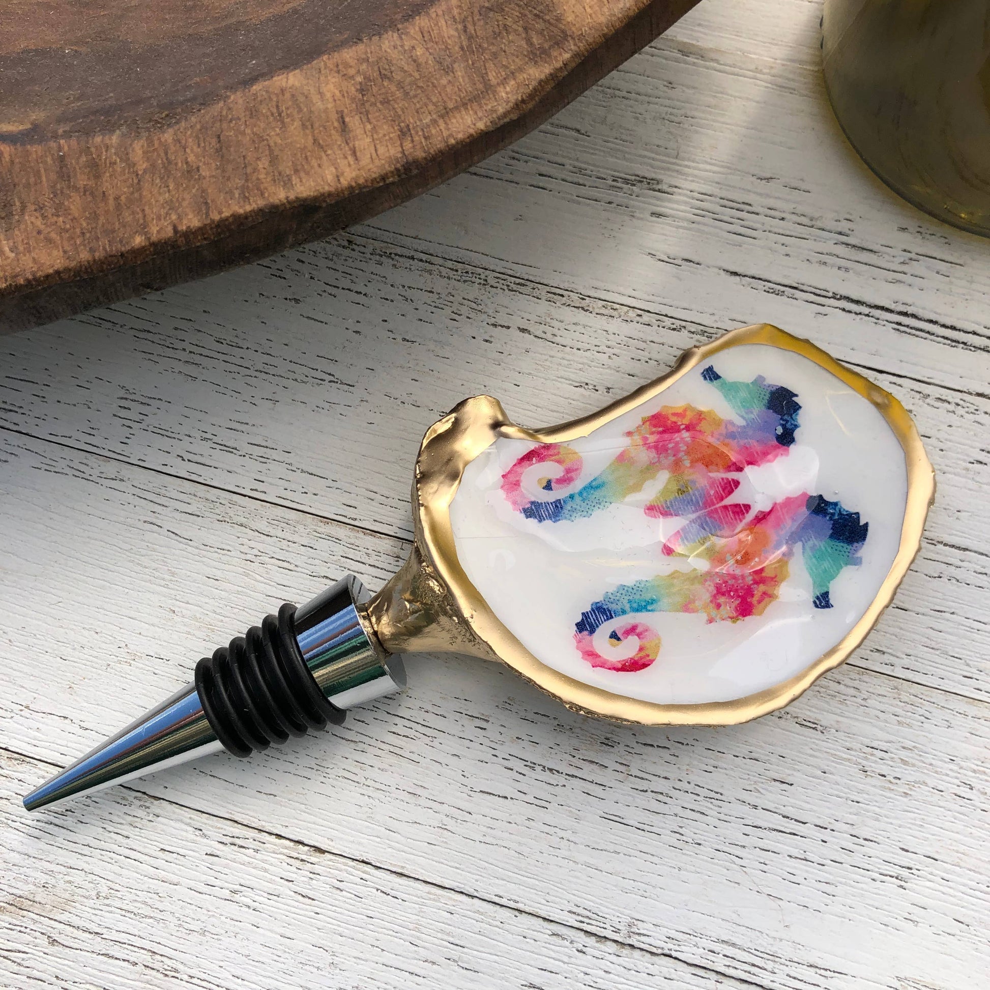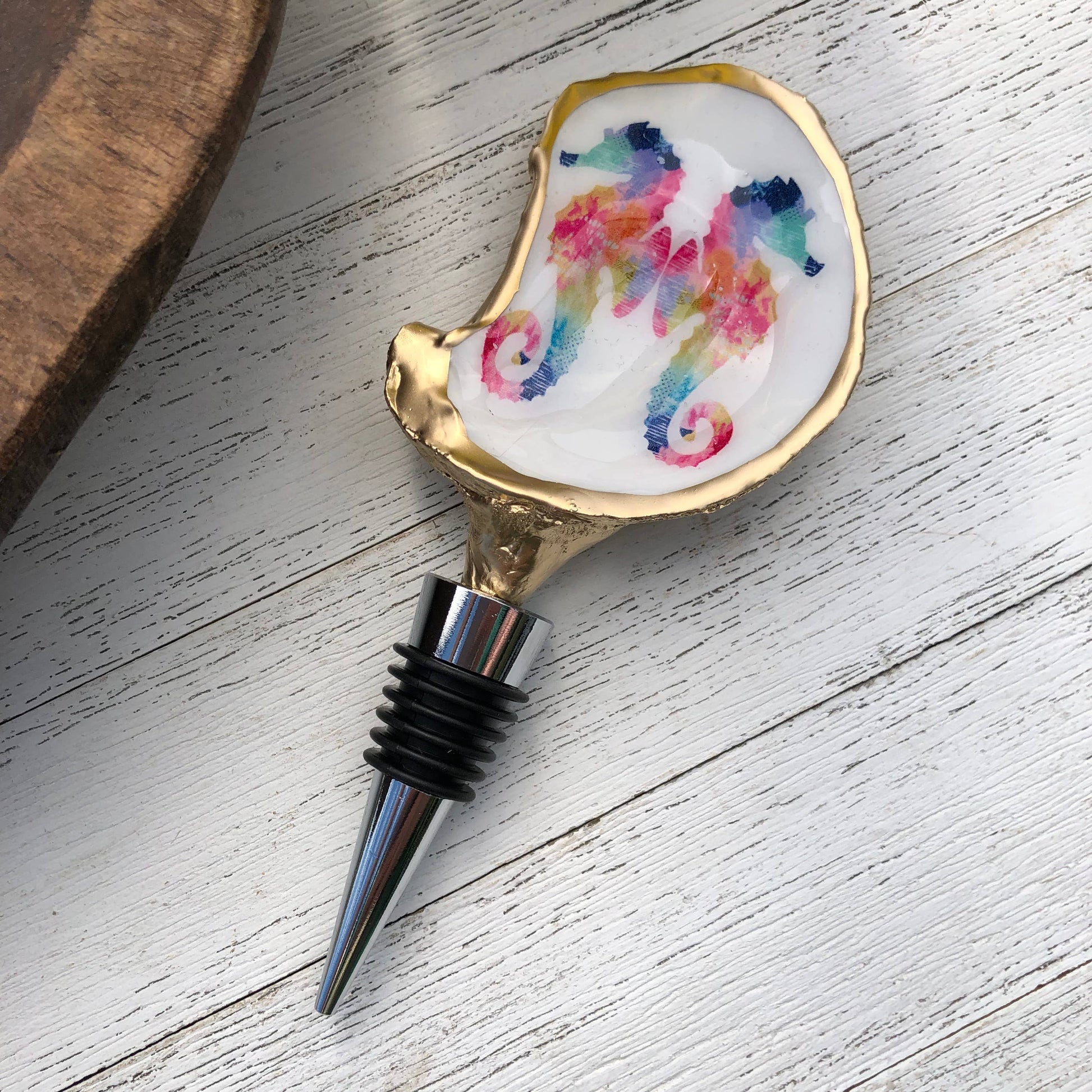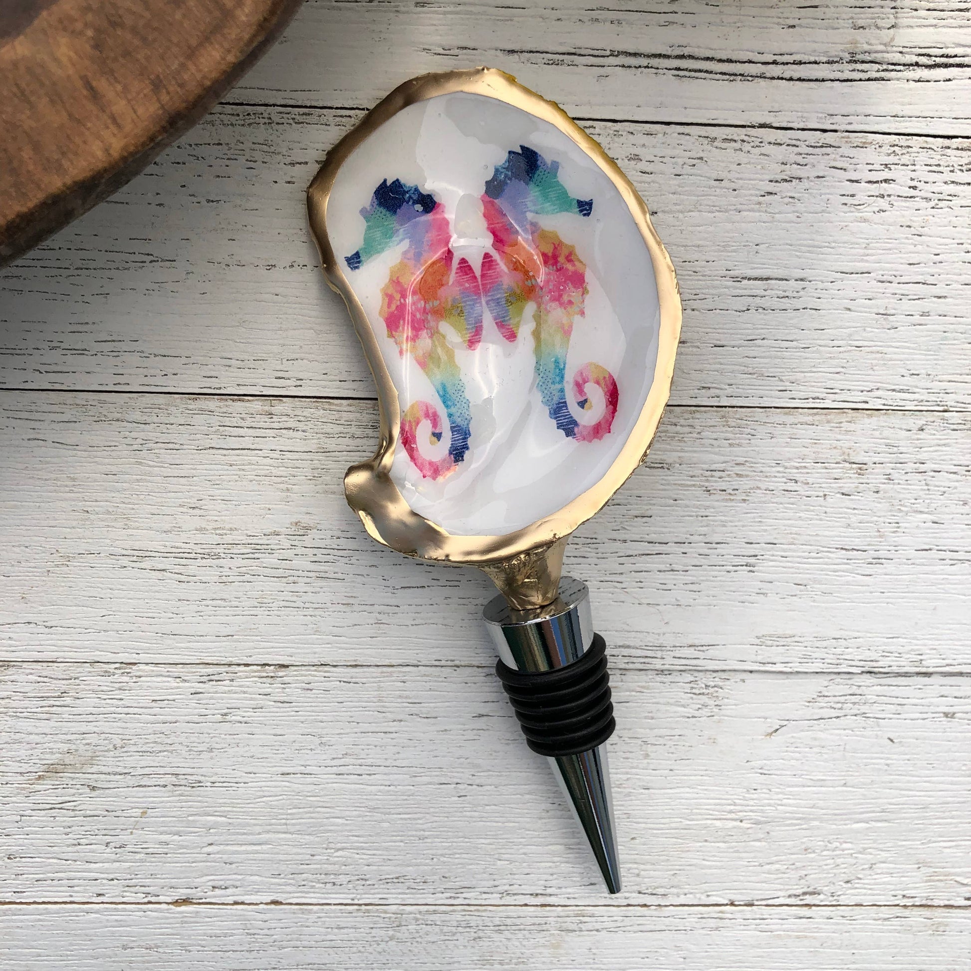 Oyster Shell Wine Stopper--Watercolor Seahorse