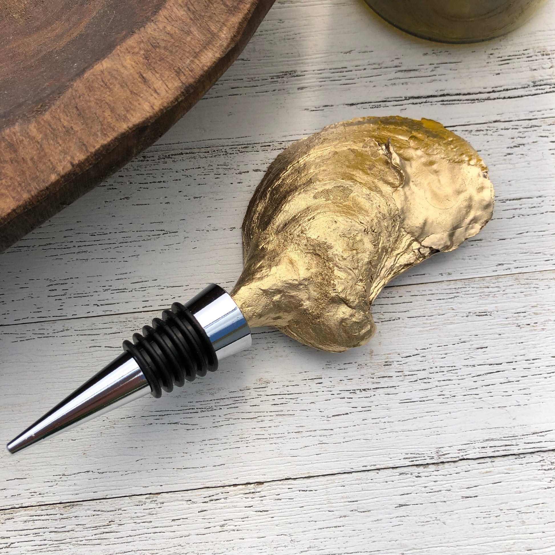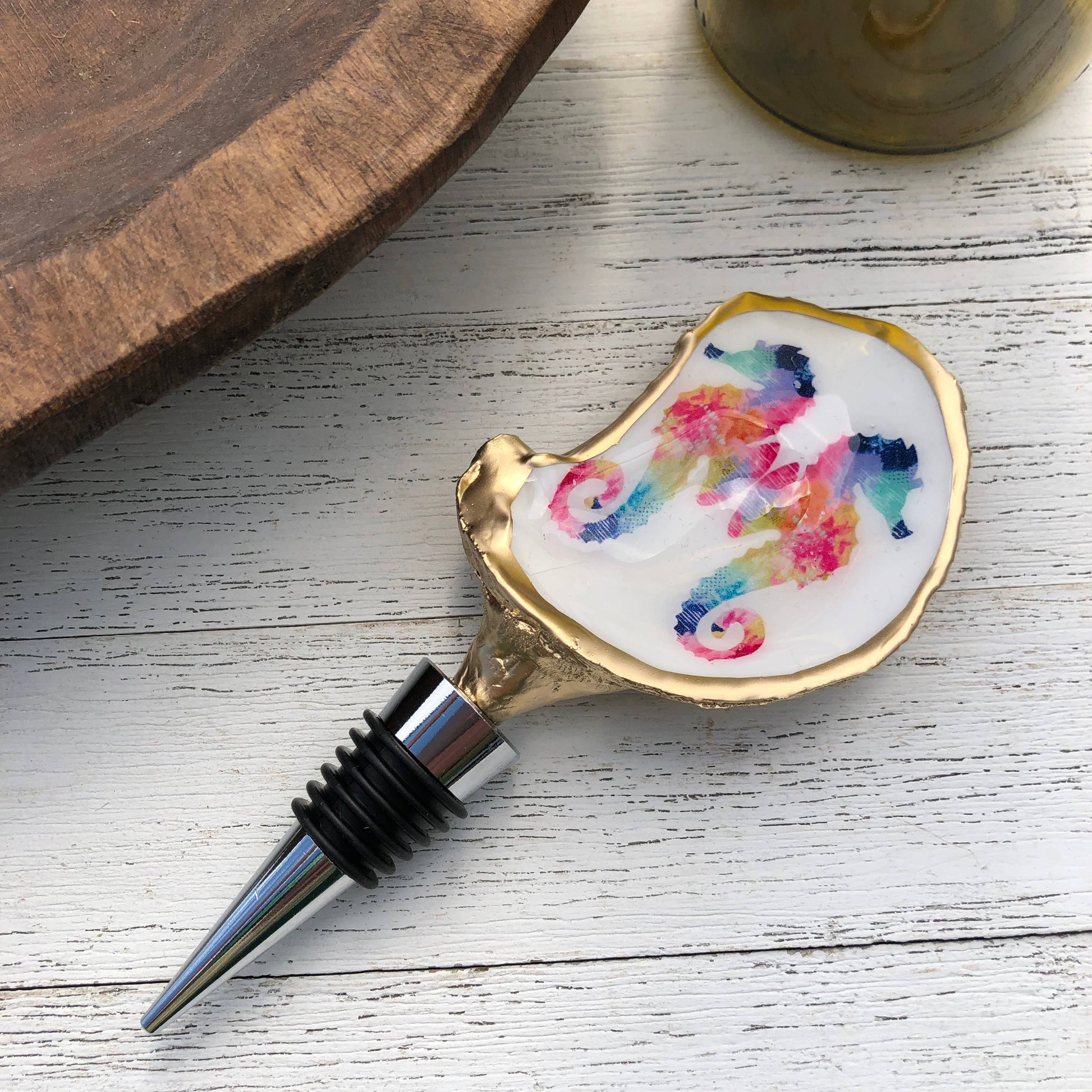 Shell Wine Stopper--Watercolor Seahorse. A unique addition to your decor for any wine lover! A gold embellished natural shell sits atop a stainless steel and silicone wine stopper and will add a little coastal flair to your next get together. Each stopper is made to order and would make a great hostess, wedding, or all occasion gift! Shells are natural and vary in size, shape and color of their interior. They typically range from 3-4.5 inches long and 2-3 inches wide. Interior of shell is left its natural color and sealed in a gloss clear varnish with a gold rim. Backside of shell is gold enamel. Care and cleaning instructions: Shell can be unscrewed from the stainless steel stopper.