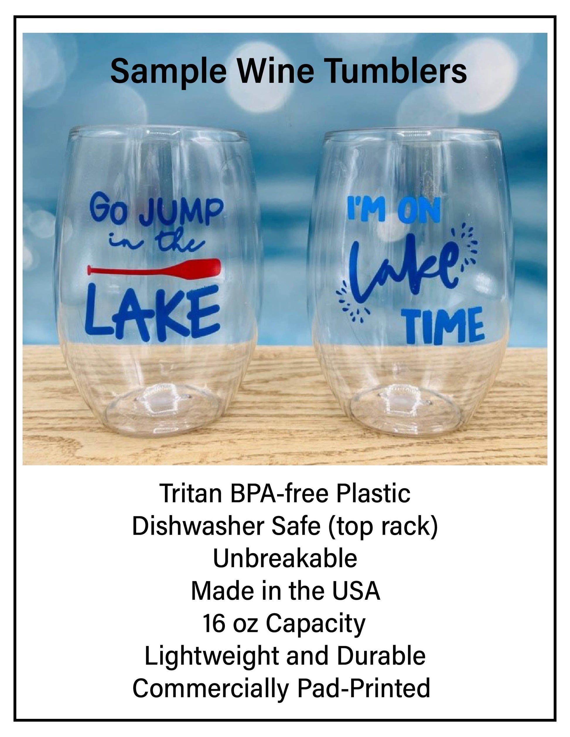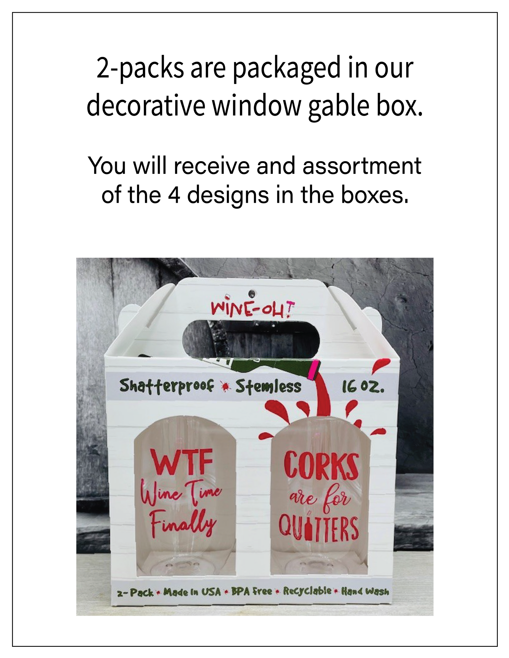 Set of four 16 oz. Unbreakable Stemless Wine Tumblers - Made with the highest quality, crystal clear, BPA-free Tritan Plastic – Lightweight – Recyclable – Reusable – Dishwasher Safe (top rack) – Made in the USA – Commercially Pad-Printed with Ink Designs. The set of 2 is packaged in a decorative window gable box. An assortment of the four designs will be placed in the boxes. Perfect for the beach, boating, poolside, camping, tailgating, the porch, vacations, cruises, holidays, girls trip, parties and more… No worries with glass breakage! Oodles of design choices and the unique and creative packaging makes this a perfect gift.