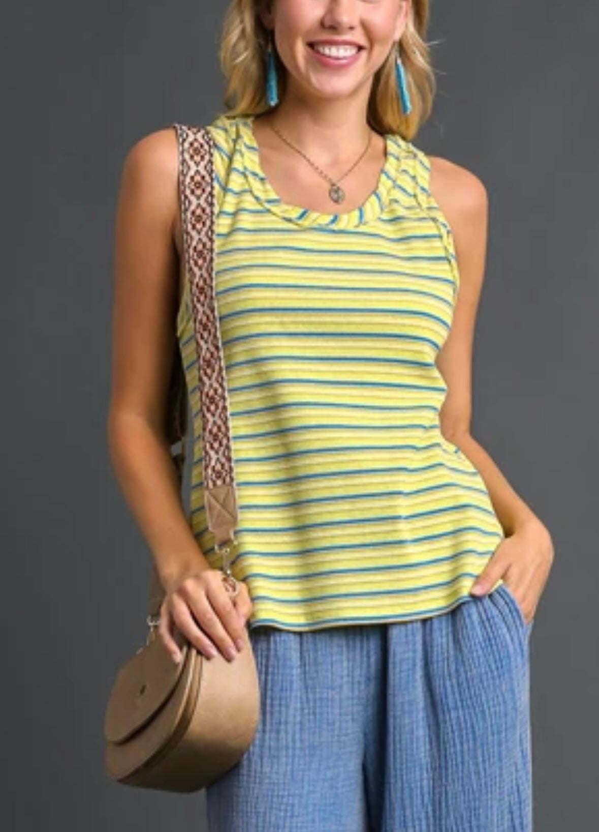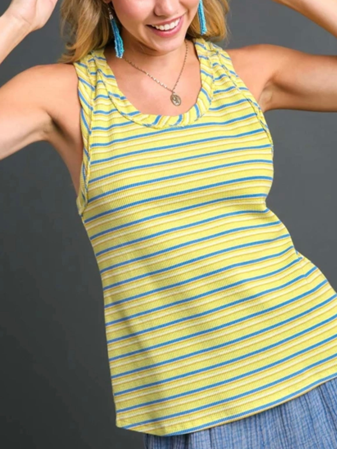 This ribbed knit tank features a fun twist detail at the neckline and sleeves, with a sporty racerback design. Its stretchy, fitted fabric makes it perfect to wear solo or layered for a playful, stylish look. Available in two colors!