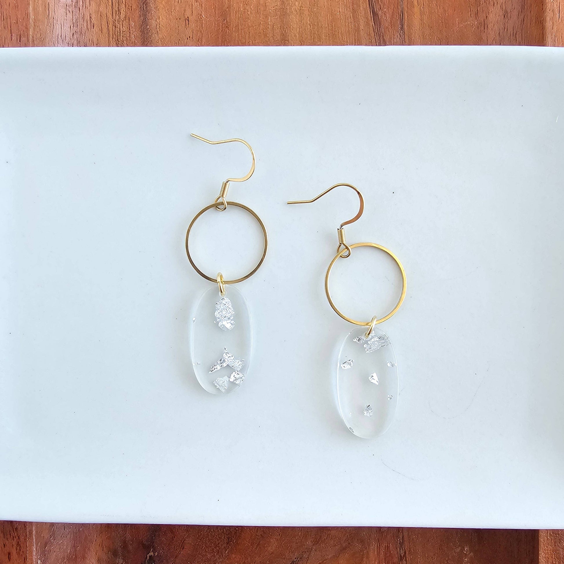 Accentuate any outfit with the stunning Rene Earrings. These dainty earrings feature clear acrylic charms in sparkling silver foil. Perfect for elevating your everyday look. * Hypoallergenic 18K gold-plated hooks * 18k gold-plated circle charm * Durable acrylic