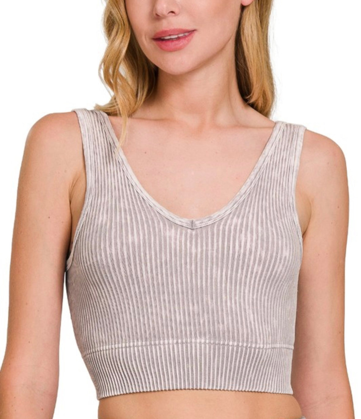 These cropped bra tanks are buttery soft and well built! Washed ribbed stretchy knit. Criss cross back. Pull-on design. Extremely comfortable with good support. Perfect under camis and halter style tops or dresses. Fit true to size.