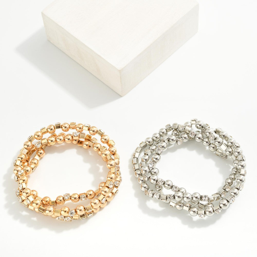 Set of Three Metal Tone Beaded Stretch Bracelets With Rhinestone Details