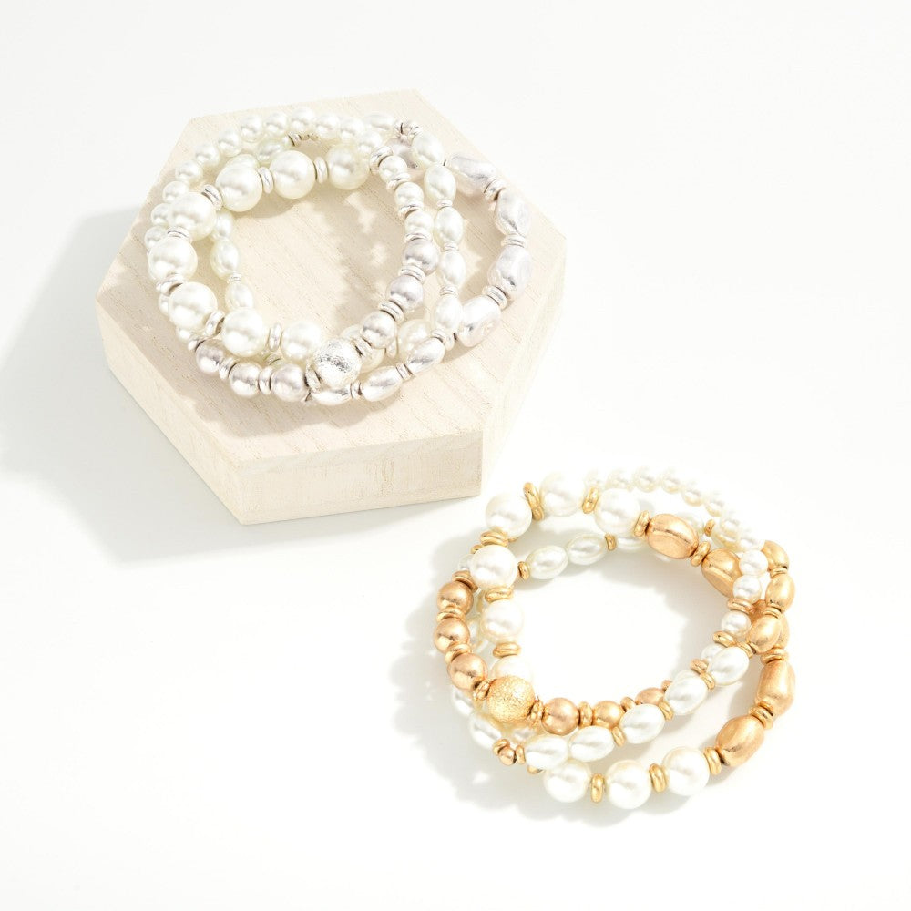 Set of Three Pearl Beaded Stretch Bracelets Featuring Metal Tone Beads