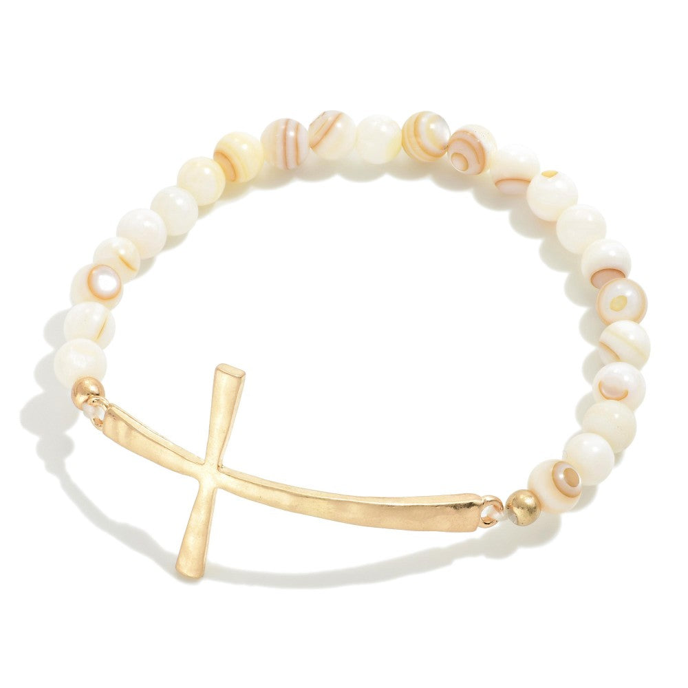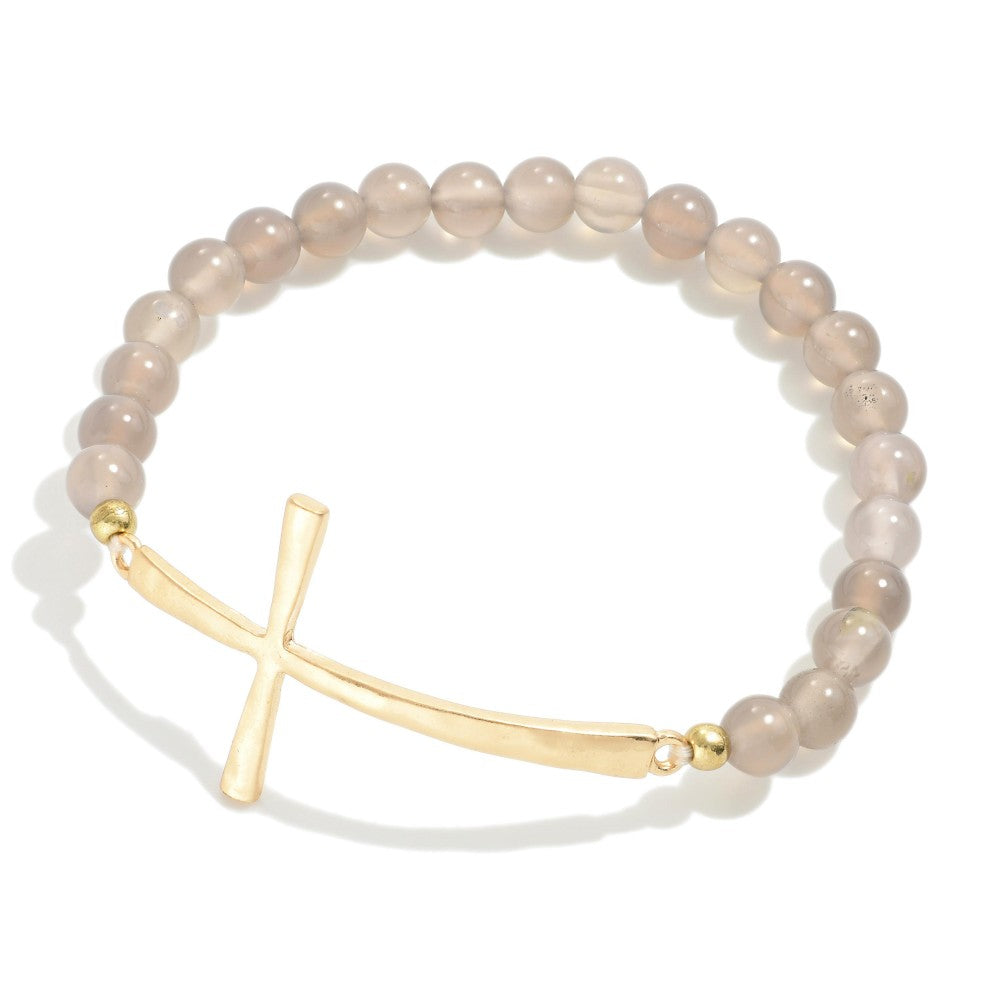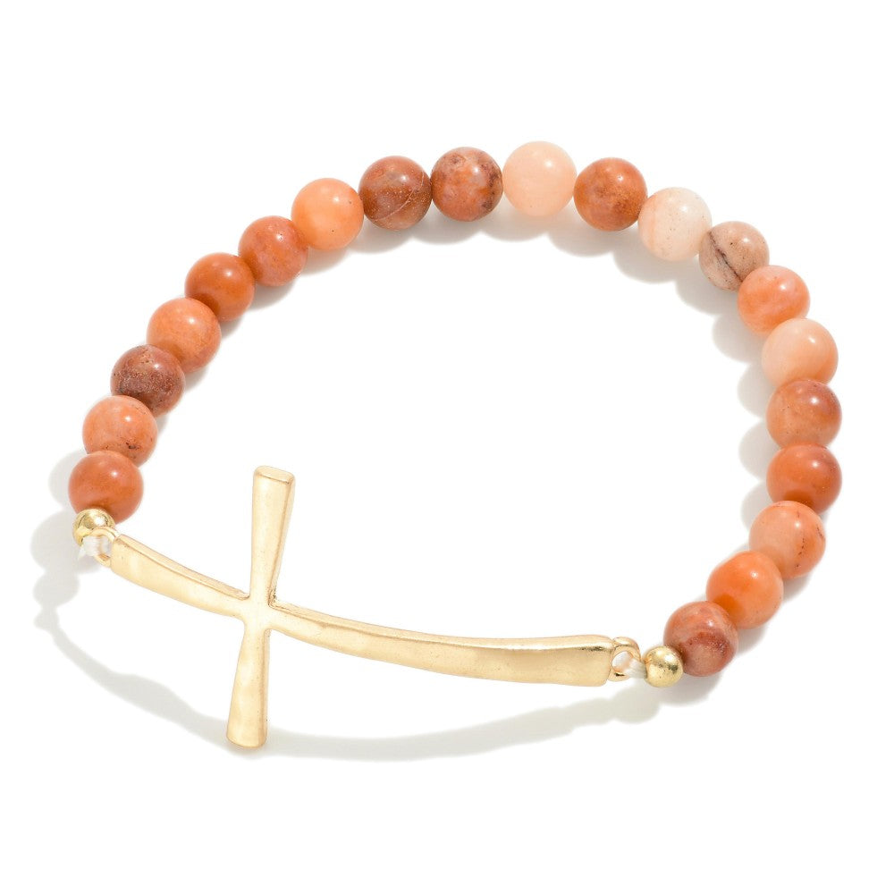 Semi-Precious Stone Beaded Stretch Bracelet With Cross