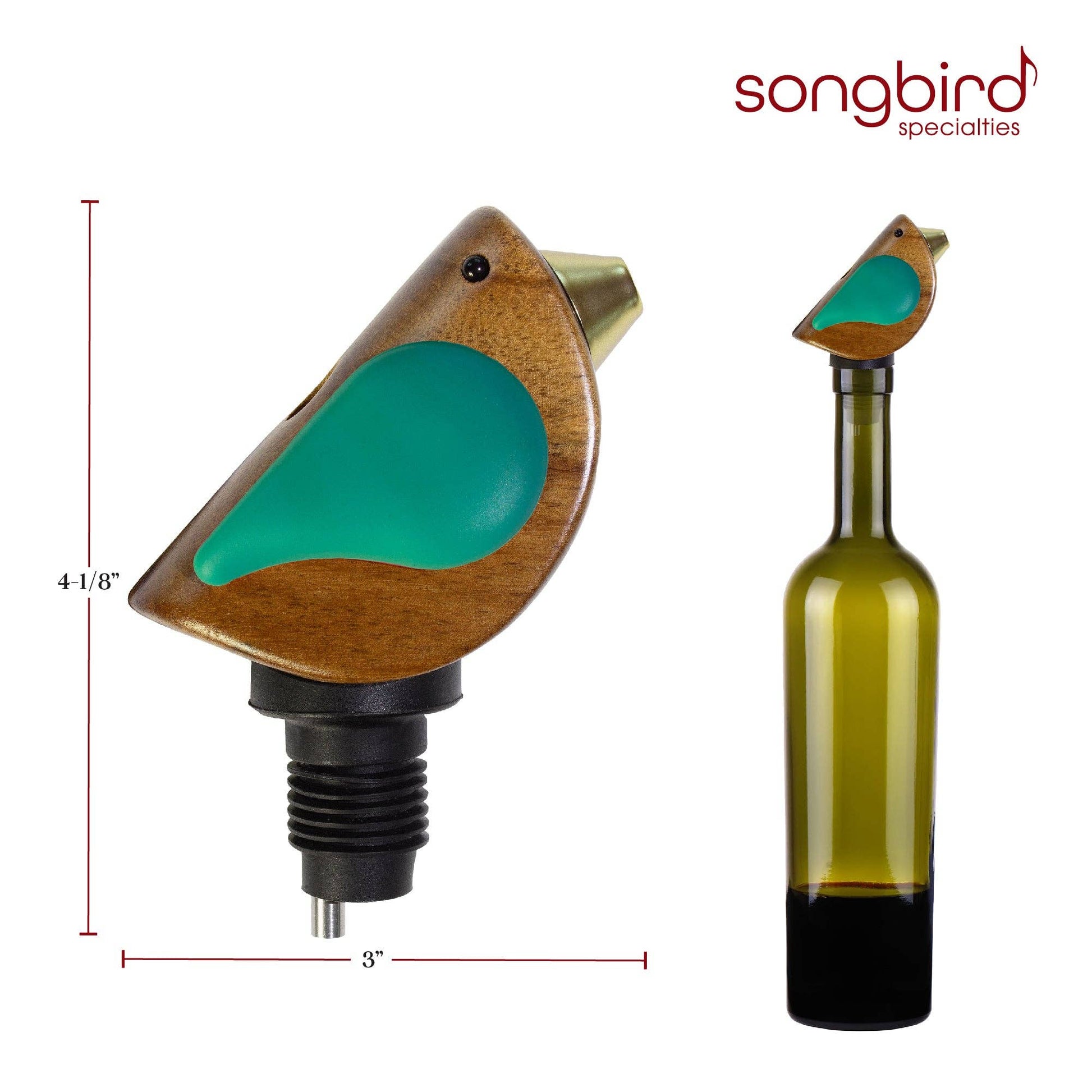 Add whimsical delight to every pour of wine for your shoppers with the Songbird Specialties® Bottle Pourer! The Songbird will "sing" as it pours to make every gathering just a little more magical. It provides a smooth, even pour for each glass of wine. It also works wonderfully for pouring vinegar, liquor, soy sauce, juice, water and more! The body of the Songbird is made from rich acacia, the wings are silicone, the beak is BPA-free plastic and the interior is high-quality stainless steel. The silicone ring at the base forms an airtight seal with the bottle, helping to keep it fresh throughout the night. The Songbird is a charming gift idea for anyone that loves wine, they'll think of the gifter with every pour! It's compact size makes it an outstanding stocking stuff too. The Songbird Specialties® Bottle Pourer measures 3" x 4-1/8" x 1-3/4".